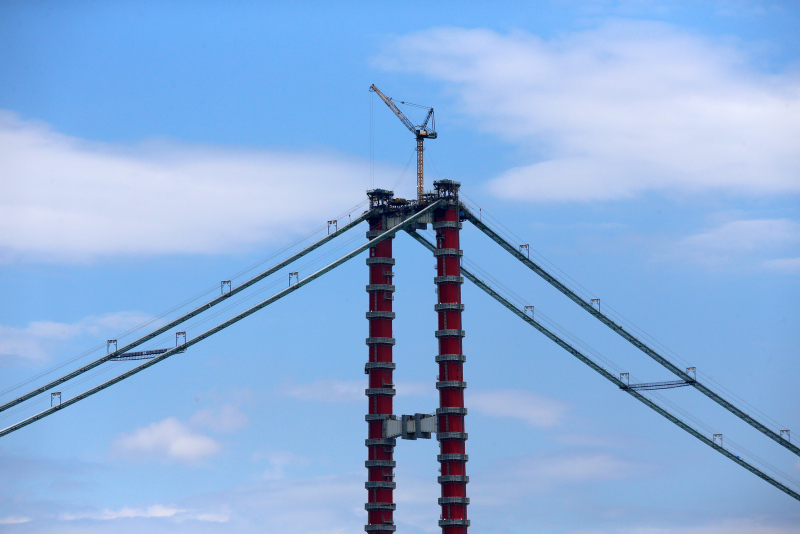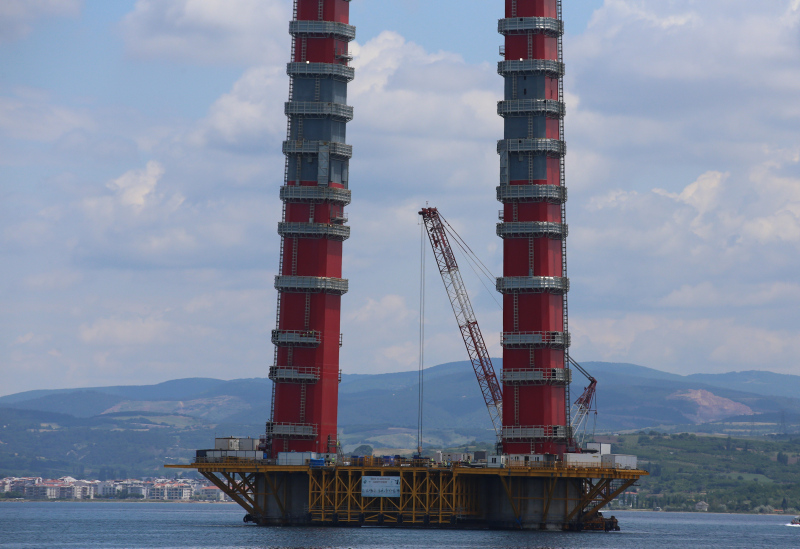Deniz üstü çalışmalar, Asya ve Avrupa yakalarındaki 318'er metre yüksekliğindeki kule ayakları tamamlandıktan sonra iki yakayı birbirine bağlayan "kedi yolu" sayesinde hızlandı.