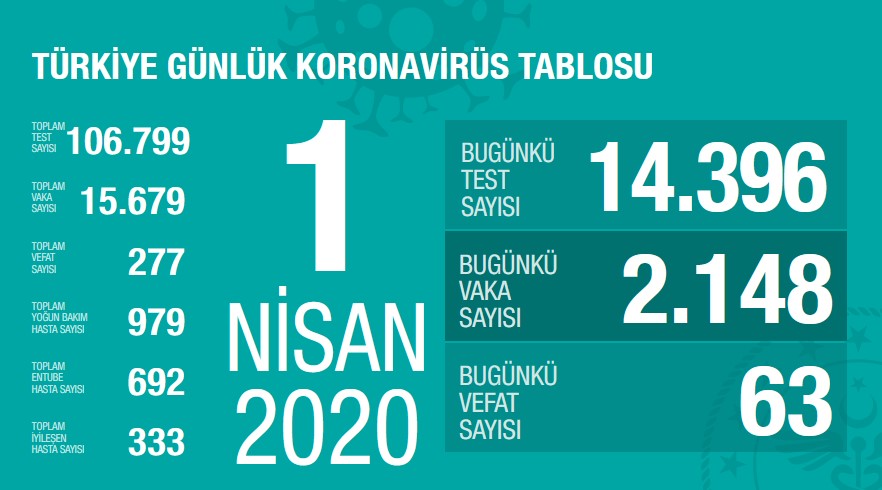 Sağlık Bakanı Fahrettin Koca, son 24 saatte 2 bin 148 kişiye yeni tip koronavirüs (Kovid-19) tanısı konulduğunu, 63 kişinin daha hayatını kaybettiğini, toplam vaka sayısının 15 bin 679'a, can kaybının ise 277'ye çıktığını, 333 kişinin taburcu edildiğini bildirdi.