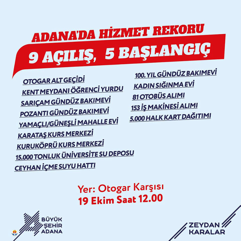 CHP Genel Başkanı Kemal Kılıçdaroğlu önceki gün Adana Büyükşehir Belediye Başkanı Zeydan Karalar'ın "Hizmet rekoru" diyerek reklamını yaptığı, yurt, kreş, bakımevi ve altgeçitlerin temellerini attı ve açılışlarını yaptı.