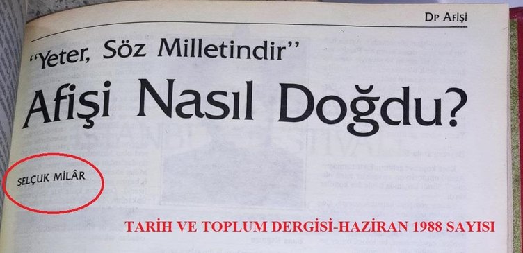 Bu sloganı bulan ve afişi hazırlayan Selçuk Milar, Tarih ve Toplum Dergisi'nin Haziran 1988 sayısında kaleme aldığı makalesinde o tarihi günleri tüm detayları ile anlatıyor.