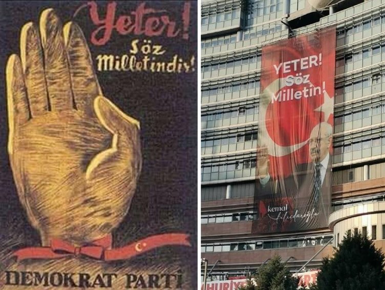 Başkan Recep Tayyip Erdoğan, DP'yi 1950'de zafere taşıyan "Yeter! Söz de, karar da, gelecek de milletindir" sözünü kullandı. Geçmişini unutan CHP'nin ise 'Yeter! Söz milletindir' sloganına sahip çıkması pes dedirtti. Bu tarihi afişi hazırlayan ve sloganı bulan mimar Selçuk Milar'ın o dönemde deşifre olması üzerine CHP'li bakan tarafından Ankara'dan Urfa'ya sürüldüğü ortaya çıktı.