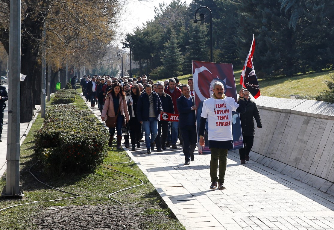 Yürüyüş boyunca, "Temiz toplum, temiz siyaset", "Hak, hukuk, adalet" sloganları atan grup üyeleri, ardından otobüslerle CHP Genel Merkezi önüne geldi.