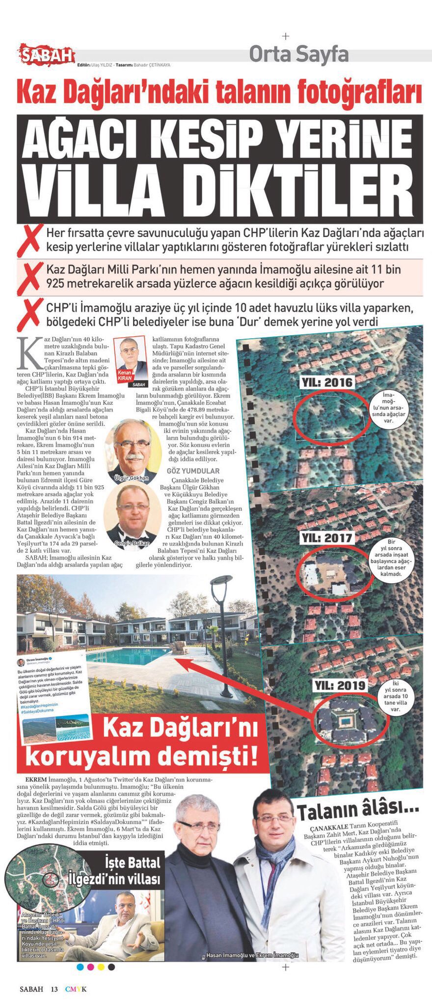 Sabah'ın haberine göre, Canan Kaftancıoğlu, "Kazdağları'nı savunalım" dedi ama Kaz Dağları'nda 11 bin 925 metrekare arsası bulunan İmamoğlu, ağaçları katlederek 10 villa yaptı!