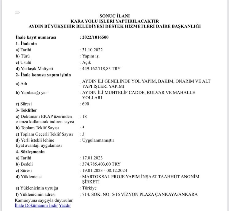 5 tekliften 3'ü geçerli sayılırken, ihaleyi KDV dahil 450 bin liraya Martoksal firması kazandı. İhalede Martoksal firmasından 27 milyon lira daha düşük teklif veren başka firmanın ihaleyi kazanamaması akıllarda soru işareti bıraktı. İhale sözleşmesi 17 Ocak 2023'te imzalandı. Firmanın, sözleşmeye göre Aydın'daki cadde, bulvar ve mahalle yollarını 19 Ocak 2023 ile 8 Aralık 2024 yılları arasında asfaltlayacağı belirtildi.