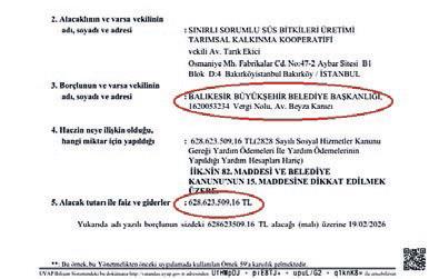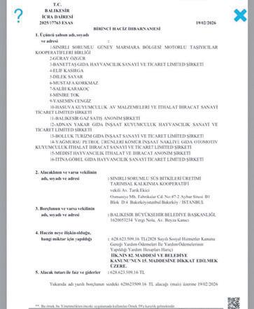 Bütün resmi taleplere rağmen ödeme alamayan kooperatif yönetimi konuyu yargıya taşıyarak haciz süreci başlattı. Balıkesir İcra Dairesi tarafından yürütülen 2025/17763 sayılı dosya kapsamında ana para olan 300 milyon liralık tutar, uygulanan faiz ve yasal masraflarla birlikte 628 milyon 623 bin 509 TL'ye ulaştı.