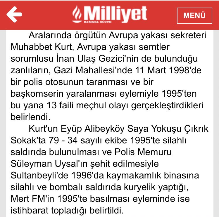 Muhabbet Kurt'un Eyüp Alibeyköy Saya Yokuşu Çıkrık Sokak'ta 79 - 34 sayılı ekibe 1995'te silahlı saldırıda bulunulması ve Polis Memuru Süleyman Uysal'ın şehit edilmesiyle Sultanbeyli'de 1996'da kaymakamlık binasına silahlı ve bombalı saldırıda kuryelik yaptığı, Mert FM'in 1995'te basılması eyleminde ise istihbarat topladığı belirtildi.