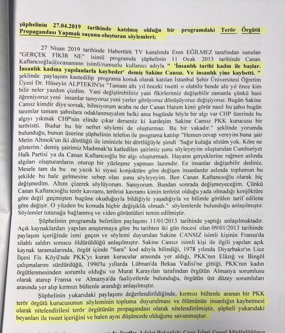 Cumhurbaşkanlığı İletişim Başkanı Prof. Dr. Fahrettin Altun'a ait ikametgah olarak kullanılan meskenin fotoğrafının çekilmesi talimatını veren CHP İstanbul İl Başkanı Canan Kaftancıoğlu'nun; MLKP terör örgütü kurucularından Hasan Ocak'a övgüler yağdırdığı öğrenildi.
