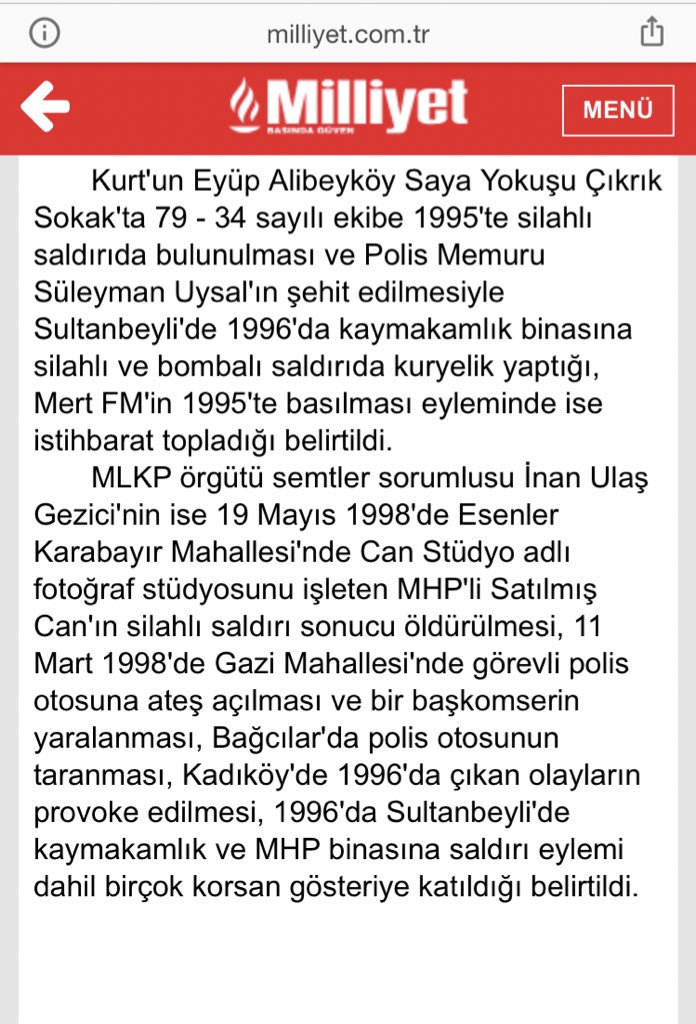 MLKP terör örgütünün Avrupa yakası sekreteri Muhabbet Kurt, Avrupa yakası semtler sorumlusu İnan Ulaş Gezici'nin de bulunduğu örgüt üyelerinin, Gazi Mahallesi'nde 11 Mart 1998'de bir polis otosunun taranması ve bir başkomserin yaralanması eylemiyle 1995'ten bu yana 13 faili meçhul olayı gerçekleştirdikleri belirlendi.