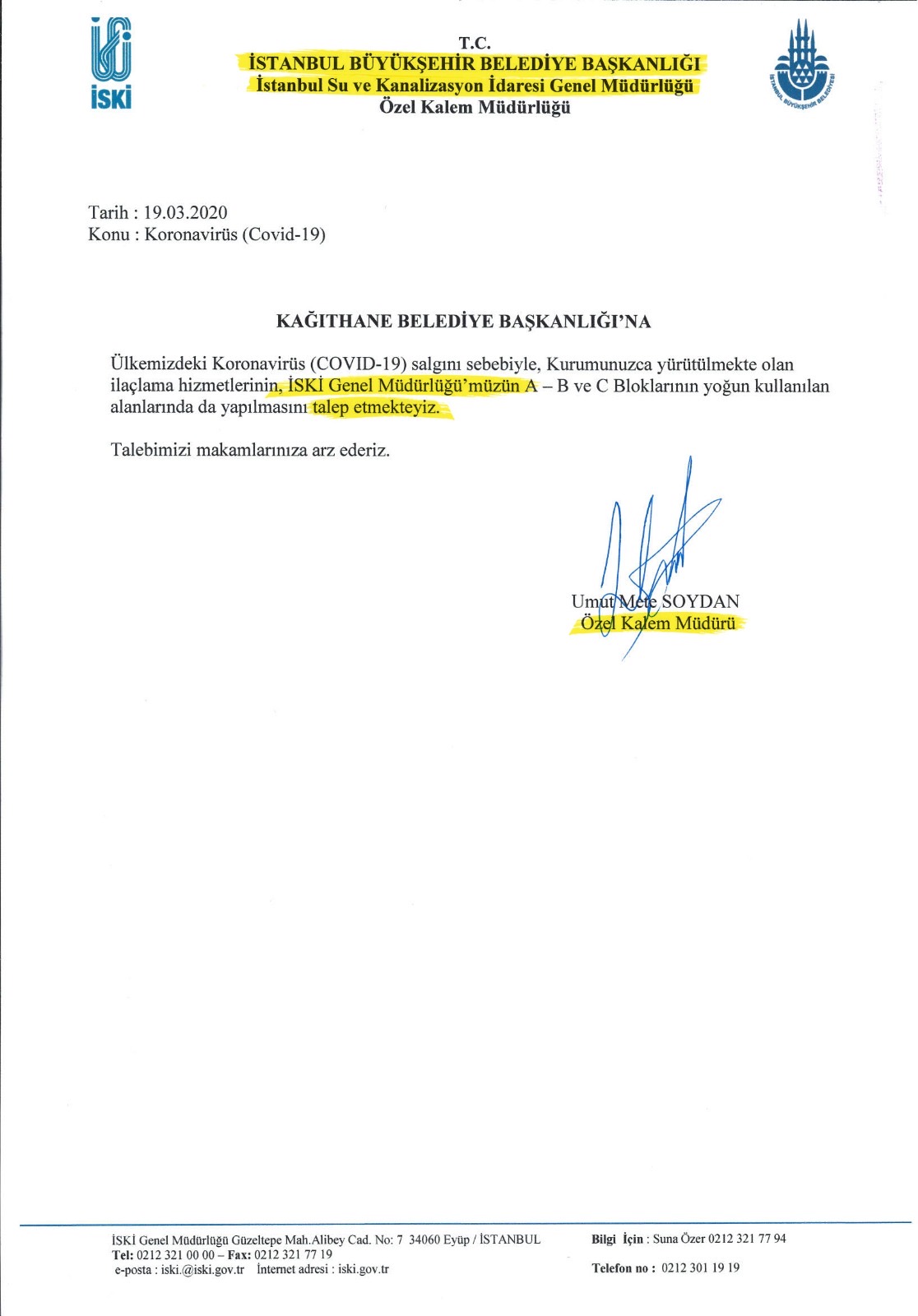 Söz konusu yazıda; "Ülkemizdeki koronavirüs (COVİD-19) salgını sebebiyle, kurumumuzca yürütülmekte olan ilaçlama hizmetlerinin, İSKİ Genel Müdürlüğü'müzünA-B-C bloklarının yoğun kullanılan alanlarında da yapılmasını talep etmekteyiz" denildi. Söz konusu yazıda, İSKİ Genel Müdürlüğü Özel Kalem Müdürü Umut Mete Soydan'ın imzası yer aldı.