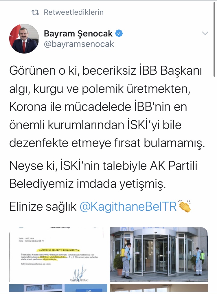 CHP'li İstanbul Büyükşehir Belediyesi Başkanı Ekrem İmamoğlu; koronavirüs sürecinde sınıfta kaldı. İBB'nin en önemli kurumlarından İSKİ, AK Partili Kağıthane Belediyesi'nden İSKİ Genel Müdürlüğü'nün ilaçlama hizmetlerinin yapılmasını talep etti. AK Parti İstanbul İl Başkanı Bayram Şenocak, "Görünen o ki, beceriksiz İBB Başkanı algı, kurgu ve polemik üretmekten, Korona ile mücadelede İBB'nin en önemli kurumlarından İSKİ'yi bile dezenfekte etmeye fırsat bulamamış. Neyse ki, İSKİ'nin talebiyle AK Partili Belediyemiz imdada yetişmiş. Elinize sağlık. Kağıthane Belediyesi" diyerek İmamoğlu'na tepki gösterdi.