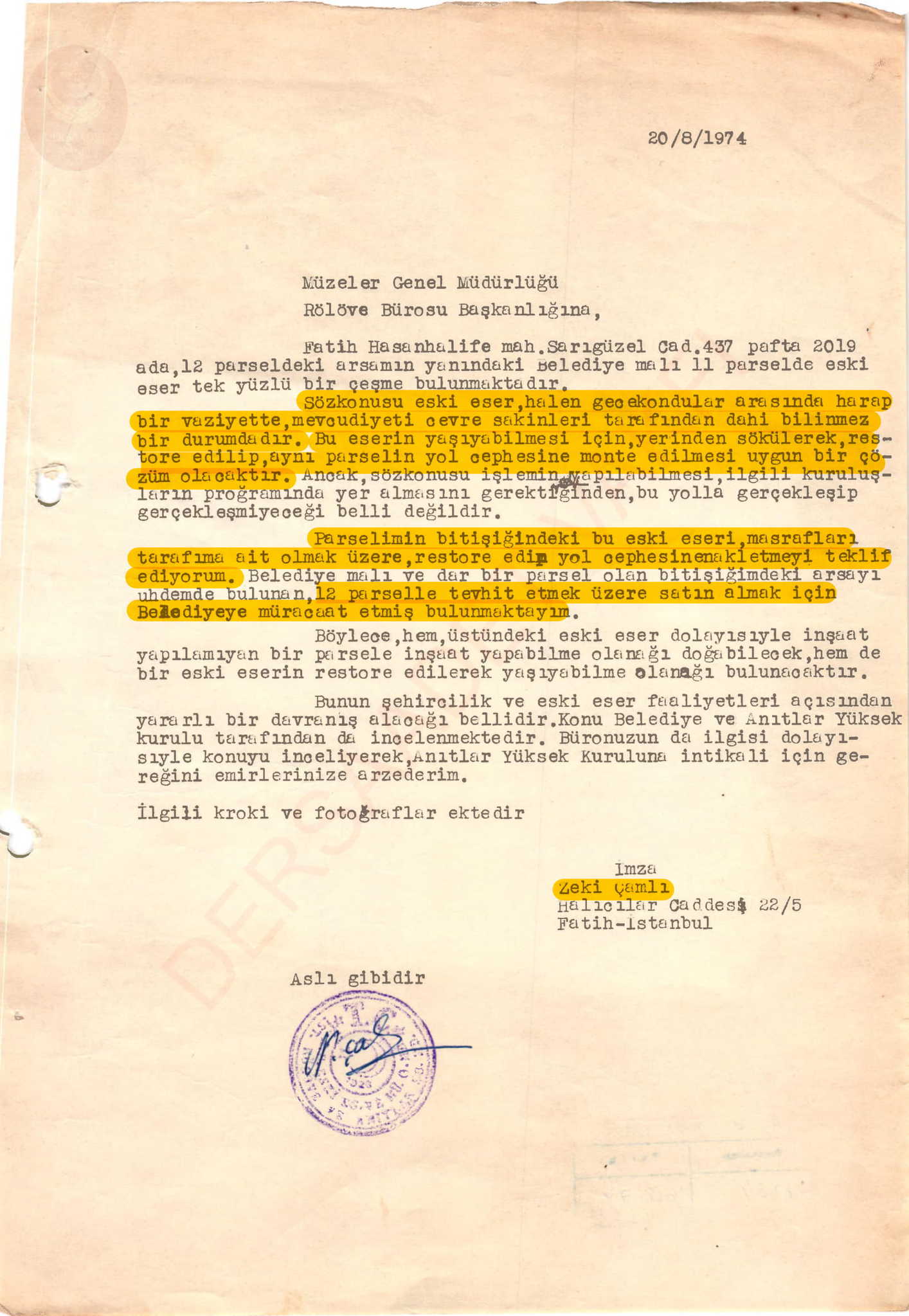 1966'da Anıtlar Yüksek Kurulu'nun 'Çeşmeyi taşıyın' kararına rağmen, aradan geçen 8 senede, CHP'li İstanbul Belediyesi'nin, tarihi esere olan ilgisizliğini gören Ahmet Zeki Çamlı; içinde çeşme bulunan parseli satın alıp, şahsen masraflarını karşılayarak; tarihi eserin, hem ihya edilmesi, hem gelecek nesillere ulaşması, hem de arsanın kullanılır hale gelmesini teklif ediyor. Teklif Anıtlar Yüksek Kuruluna sunuluyor. (Tarih 1974 ve arsa sahibi halen CHP'li İstanbul Belediyesi.)