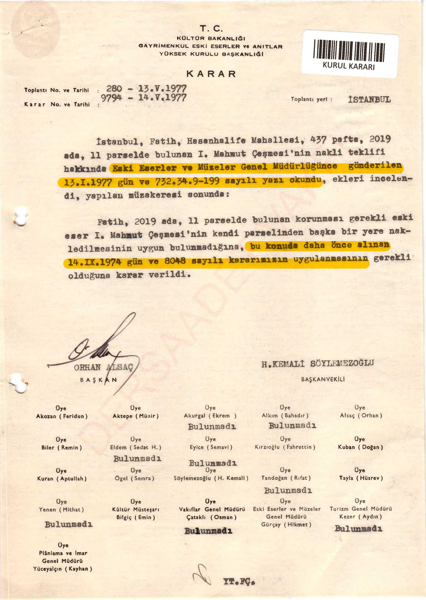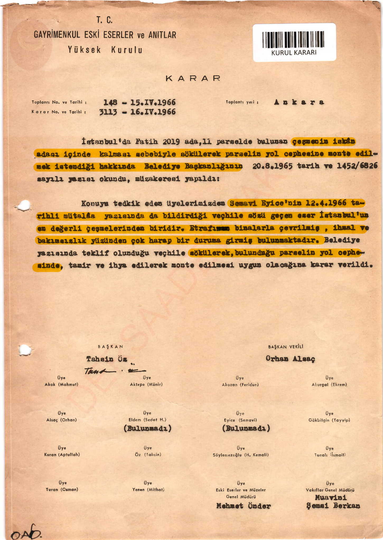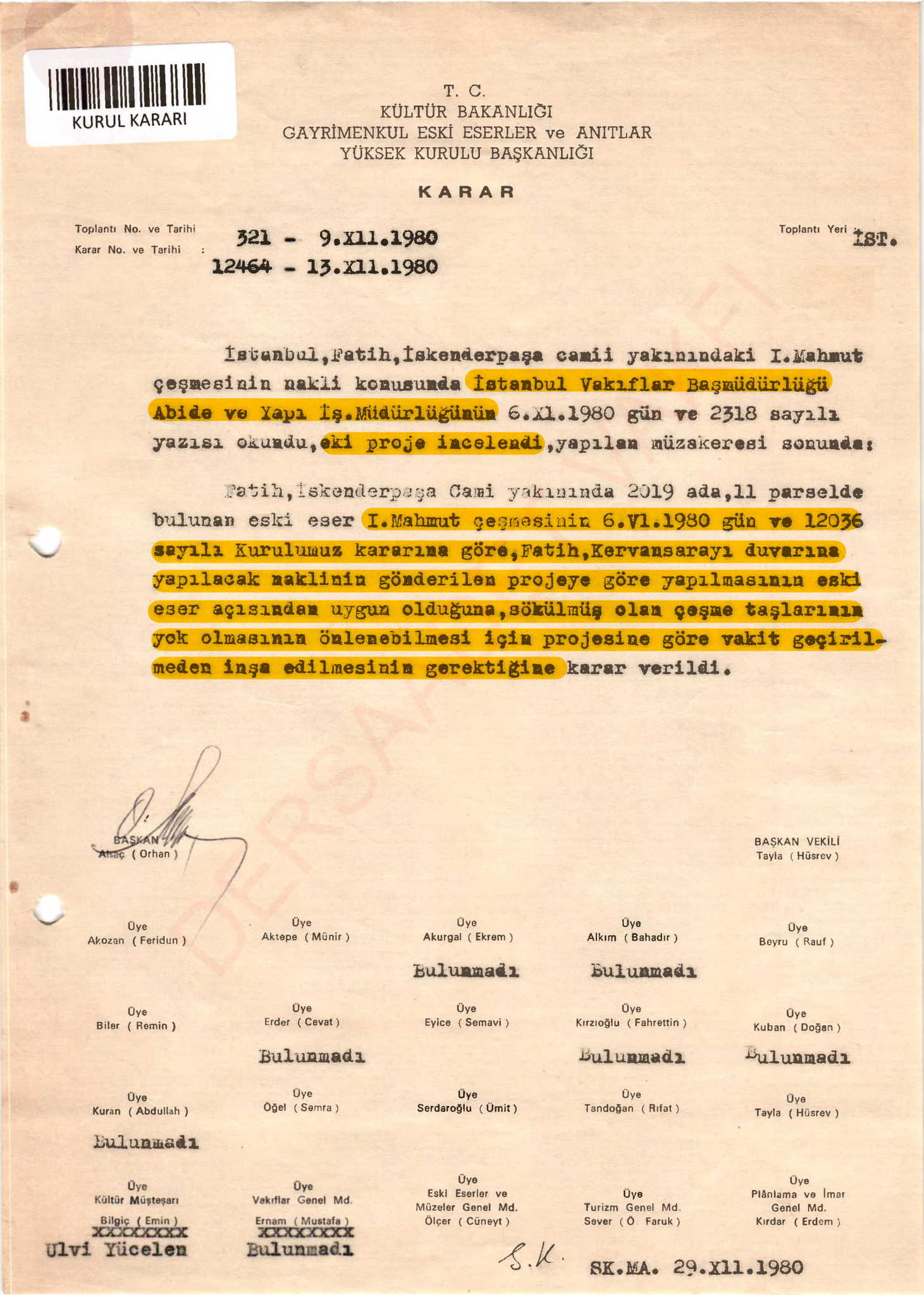 Gayrimenkul Eski Eserler Ve Yüksek Kurulu kararında tetkik ve teşhis edilip ihya edilerek yerinden başka bir yere taşınmasını CHP'li İstanbul Belediyesi'nin talebiyle Anıtlar Yüksek Kurulu'nun karar verdiği açıkça görülüyor.
