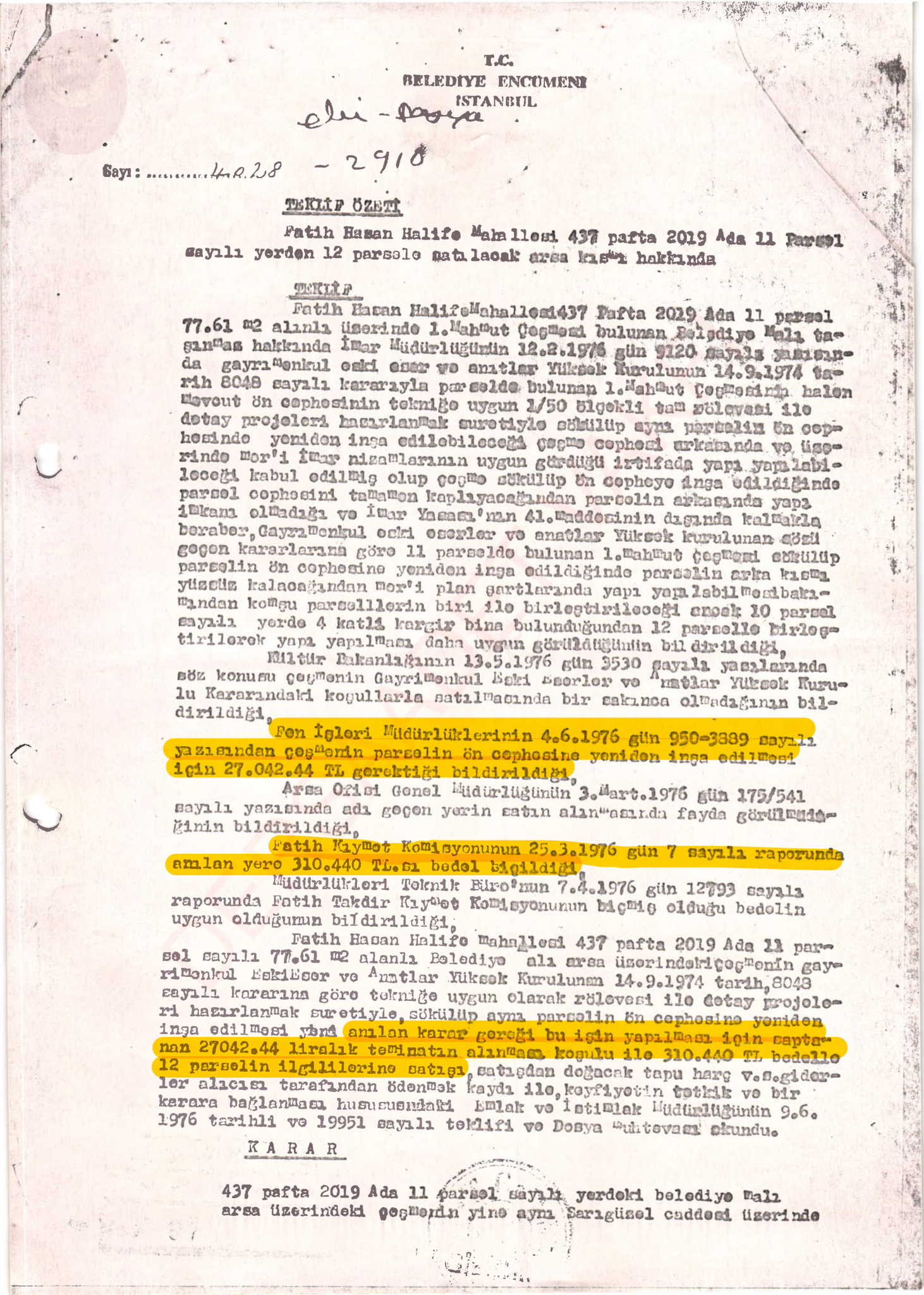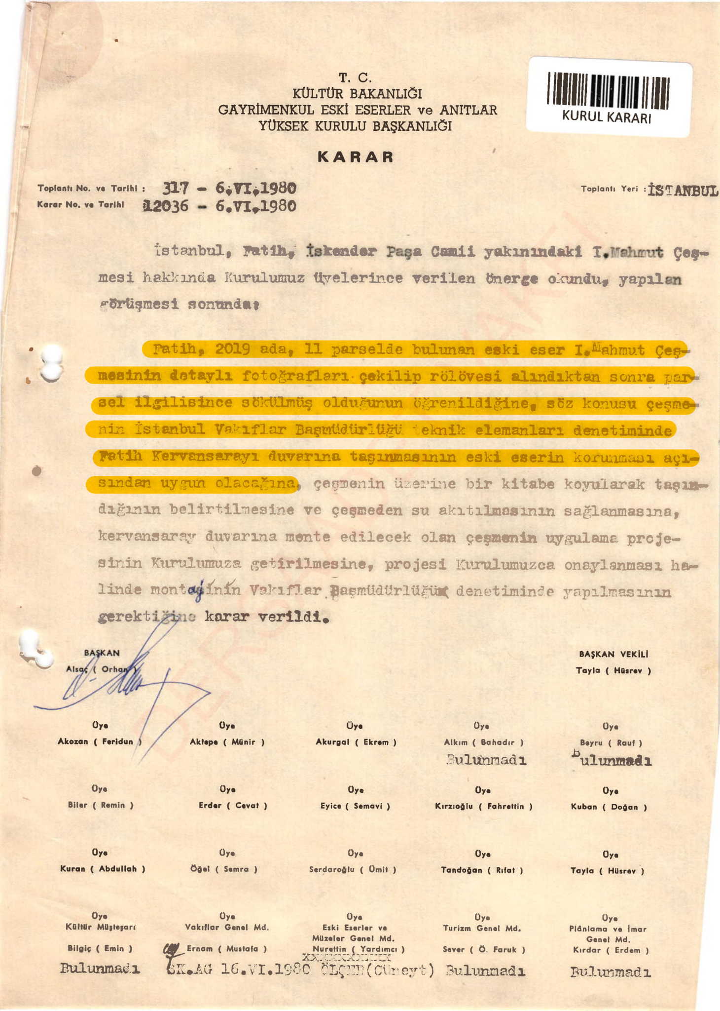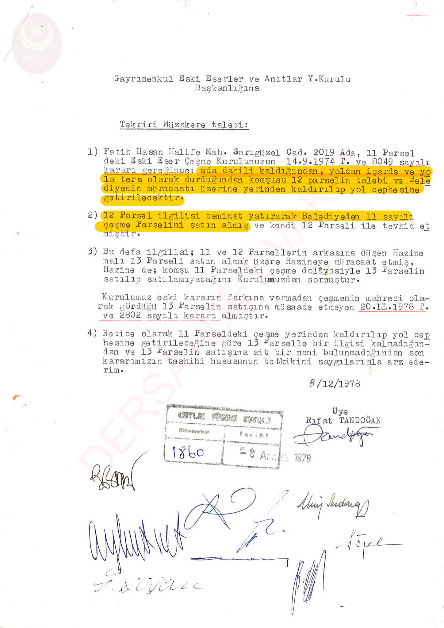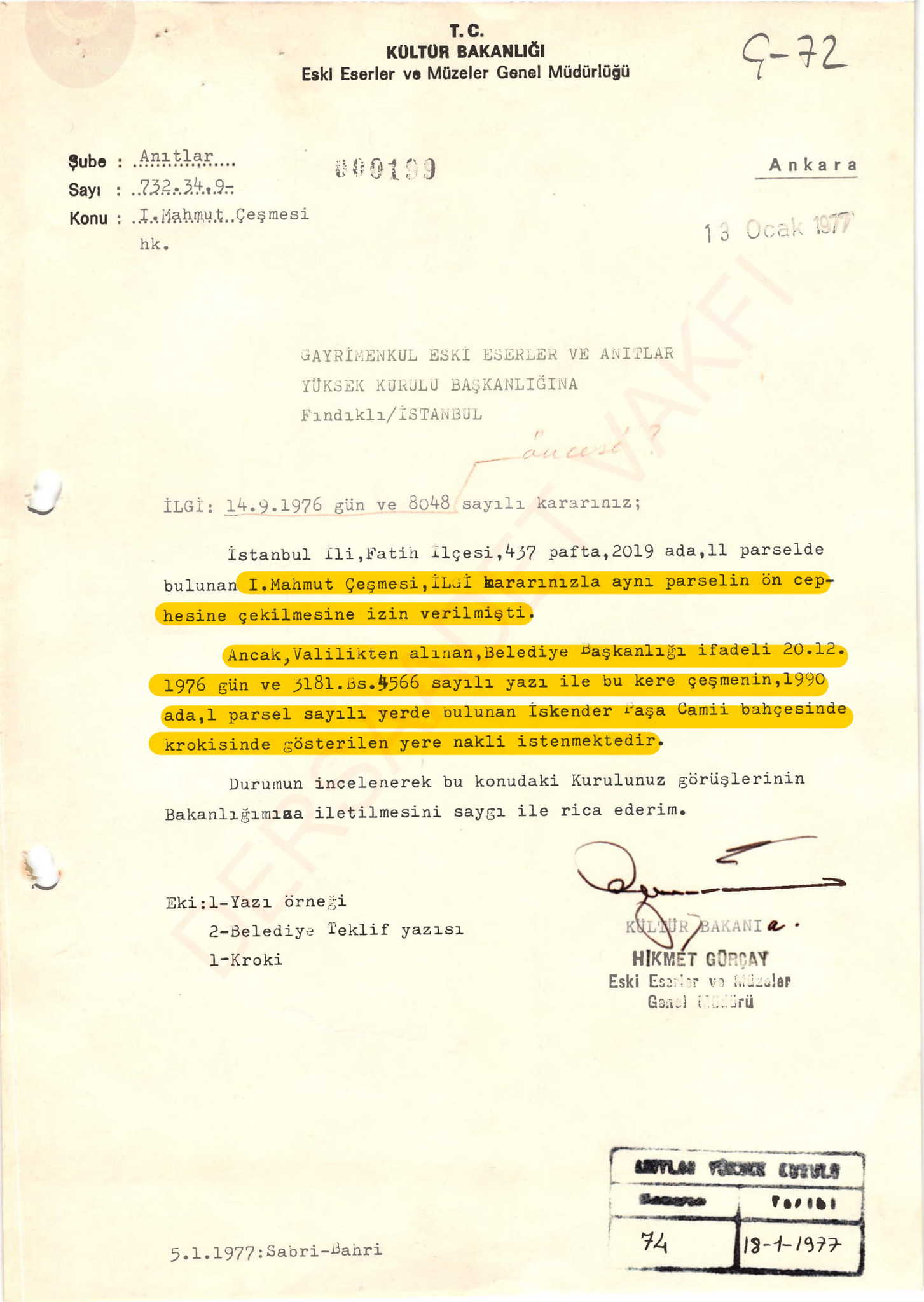 Gayrimenkul Eski Eserler Ve Yüksek Kurulu kararında tetkik ve teşhis edilip ihya edilerek yerinden başka bir yere taşınmasını CHP'li İstanbul Belediyesi'nin talebiyle Anıtlar Yüksek Kurulu'nun karar verdiği açıkça görülüyor.