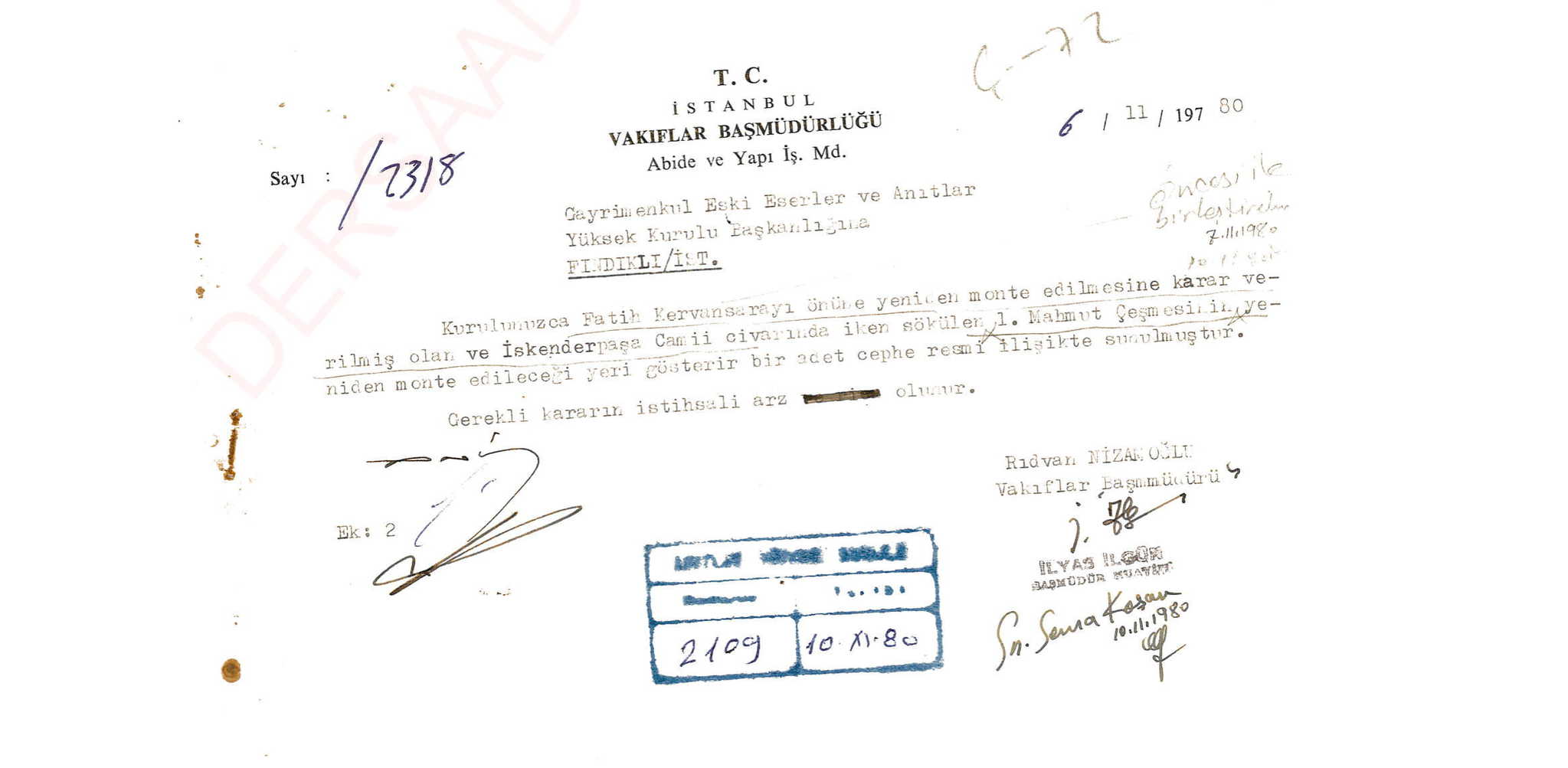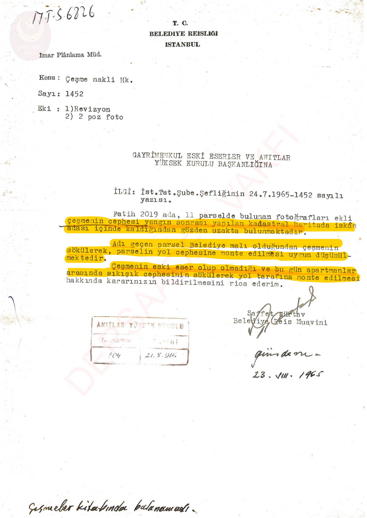 CHP'li İstanbul Belediyesi 1966 yılında içinde çeşme kalıntısı olan araziyi satmak için Anıtlar Kurulu'na çeşmenin yer değiştirmesi talebi doğrultusunda yazı yazıyor.