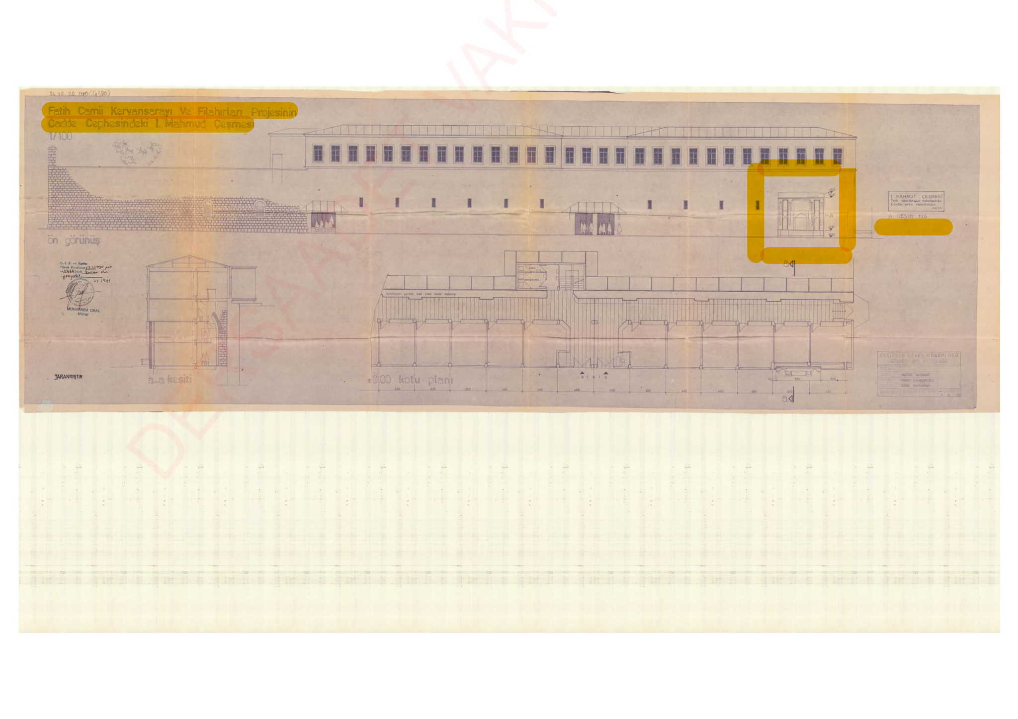 Vakıflar Başmüdürlüğü - Abide ve Yapı İşleri Müdürlüğü, çeşmenin Fatih Fevzipaşa Caddesinde inşaat halinde olan Kervansaray duvarında ihyası için gerekli projeyi hazırlıyor ve Anıtlar Yüksek Kurulu bu projeye onay veriyor. Bu proje için gerekli para; belediye tarafından, satışta Ahmet Zeki Çamlı'dan banka teminatı olarak zaten alınmış.