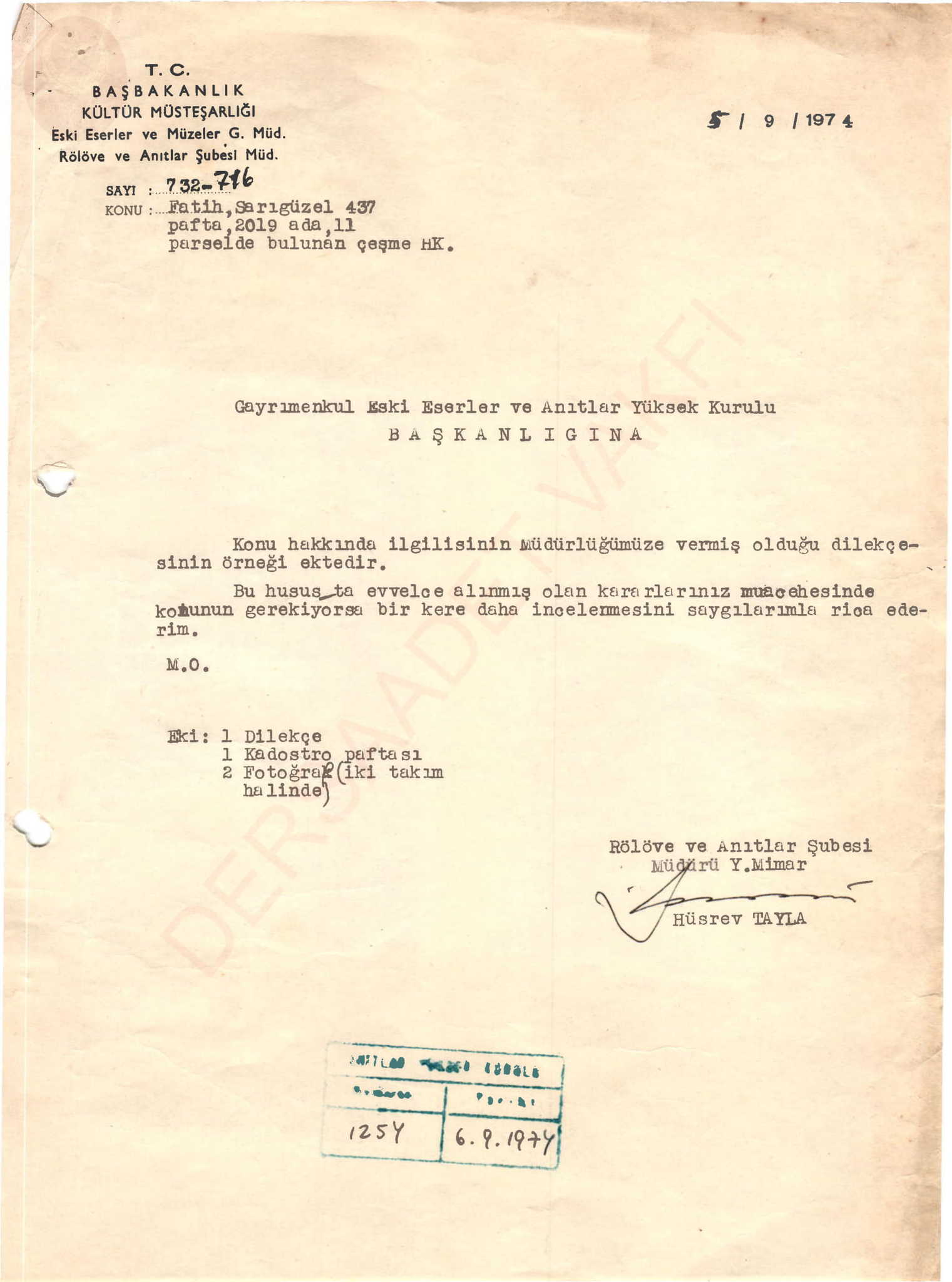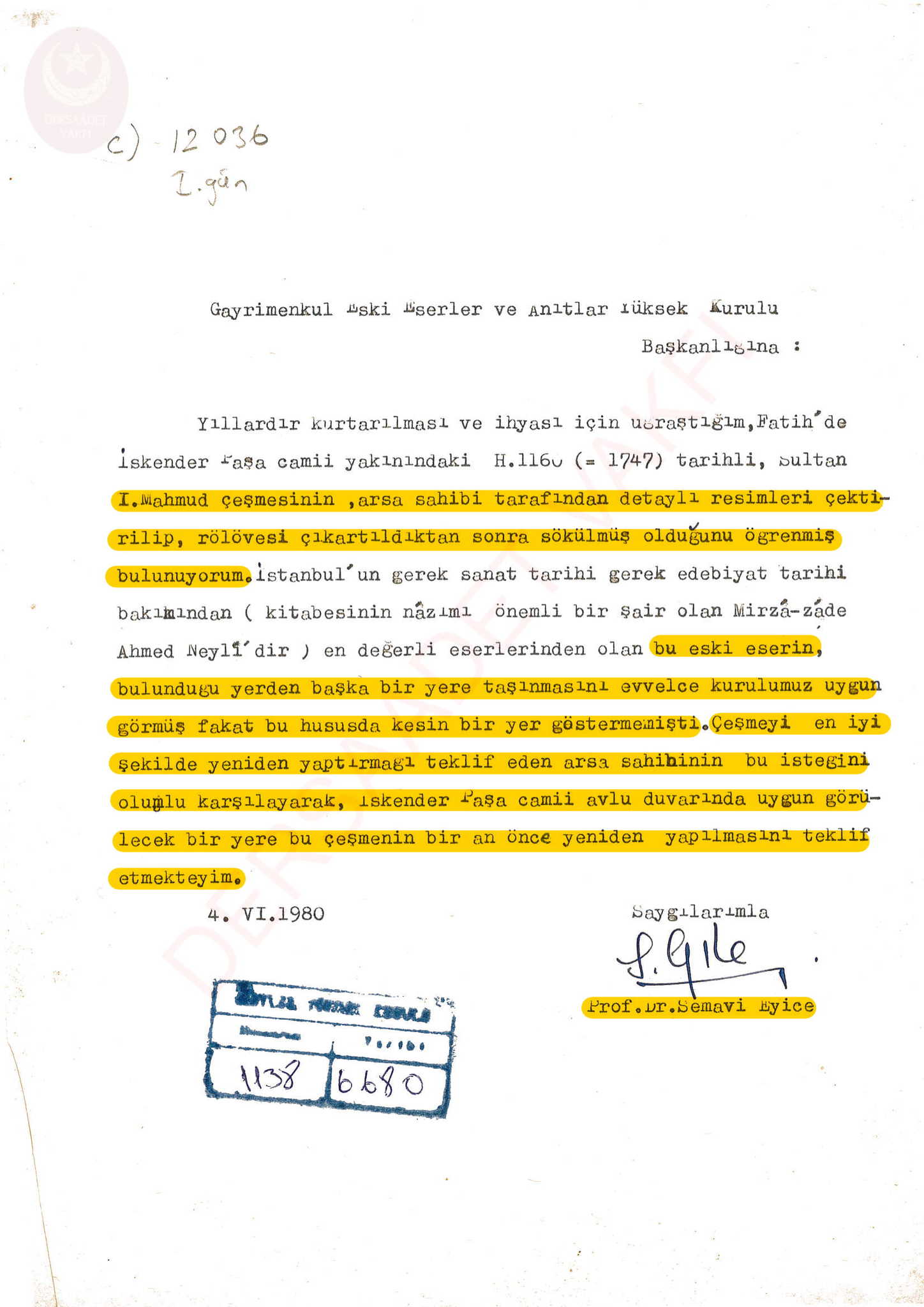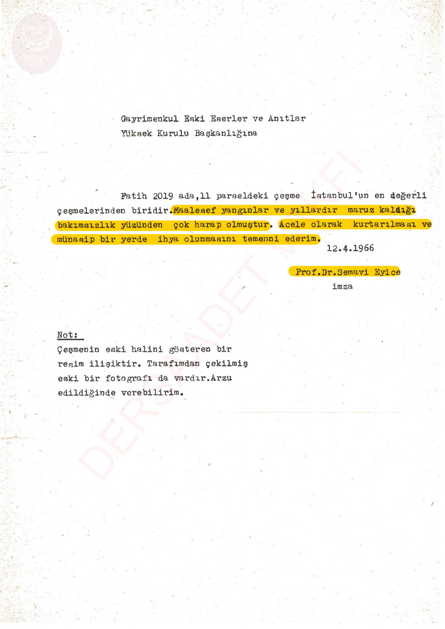 GERÇEK: Semavi Eyice, 12 Nisan 1966 yılında, Gayrimenkul Eski Eserler Ve Yüksek Kurulu Başkanlığı'na yazdığı yazıda, çeşmenin çıkan yangınlar ve yıllardır maruz kaldığı bakımsızlık yüzünden harap bir halde olduğu, acilen müdahale edilip olduğu yerden kurtulmasını istiyor.