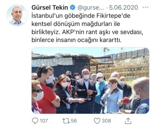 CHP İstanbul Milletvekili Gürsel Tekin, 2020 yılında sosyal medyada kentsel dönüşüm karşıtlığını şu şekilde bildirdi: "İstanbul'un göbeğinde Fikirtepe'de kentsel dönüşüm mağdurları ile birlikteyiz. AKP'nin rant aşkı ve sevdası binlerce insanın ocağını kararttı."