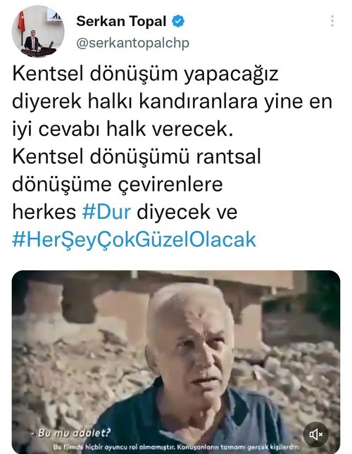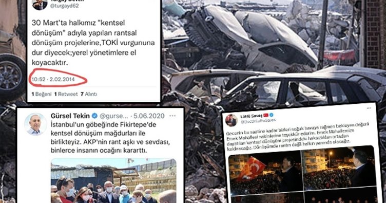 CHP'li Hatay Büyükşehir Belediye Başkanı Lütfü Savaş'ın kentsel dönüşüme karşı düzenlediği miting görüntülerinin ardından CHP'li vekillerin de kentsel dönüşüme karşı çıktığı ifadeleri ortaya çıktı. CHP İstanbul Milletvekili Gürsel Tekin'in İstanbul'da yapılan kentsel dönüşüme karşı "AKP'nin rant aşkı ve sevdası binlerce insanın ocağını kararttı" sözleri tekrar gündem oldu. İşte CHP'li vekillerin 'istismar' dönüşümü...