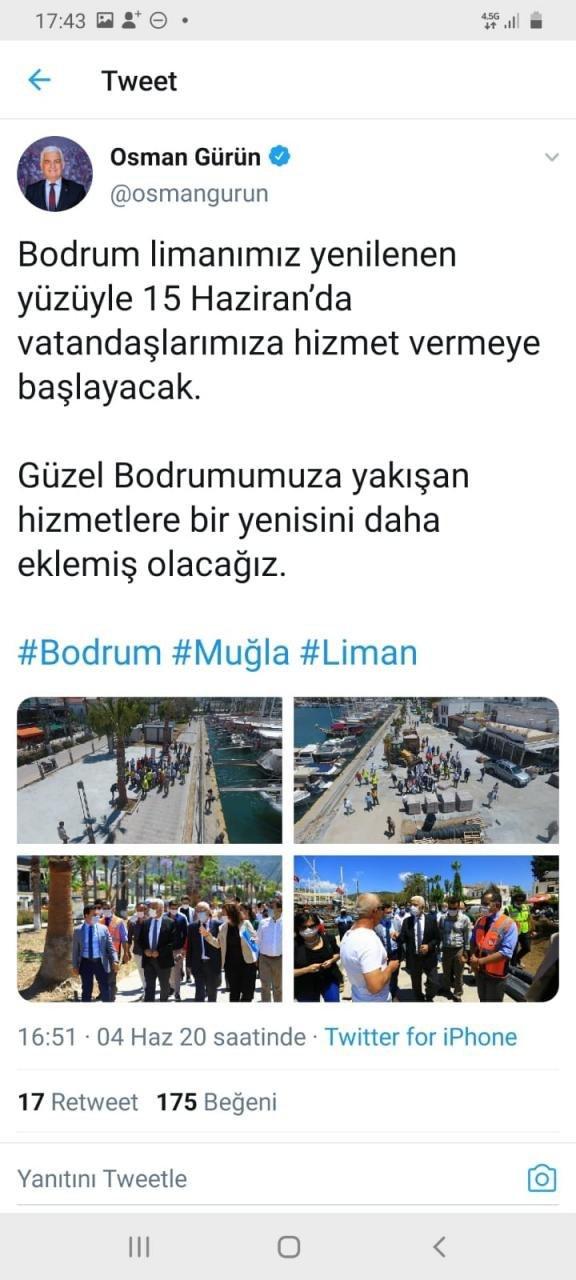 Sabah sahil yürüyüşünü bile etkileyen ve aylardır bitmeyen Bodrum Yat Limanı Altyapı ve Meydan Düzenlemesi'nin bir an önce bitmesini isteyen Bodrumlular'ın tepkileri üzerine CHP'li Muğla Büyükşehir Belediye Başkanı Osman Gürün, Twitter hesabı üzerinden bir açıklama yapmıştı.