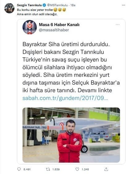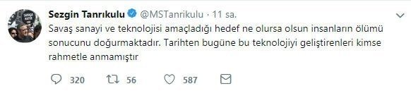 Tanrıkulu İHA ve SİHA'ları yine hedef alarak, sosyal medya hesabından iftiralarına devam etti. Yaptığı paylaşımda PKK ile mücadelede önemli silahlardan biri olan SİHA'ların üretici firmasını hedef gösterdi. Sezgin Tanrıkulu, "BAYRAKTAR adlı Silahlı İnsansız Hava Araçları sivil yurttaşları vurdu, öldürdü. Bütün alçaklığınıza rağmen bunu teşhir etmeye devam edeceğim."dedi.