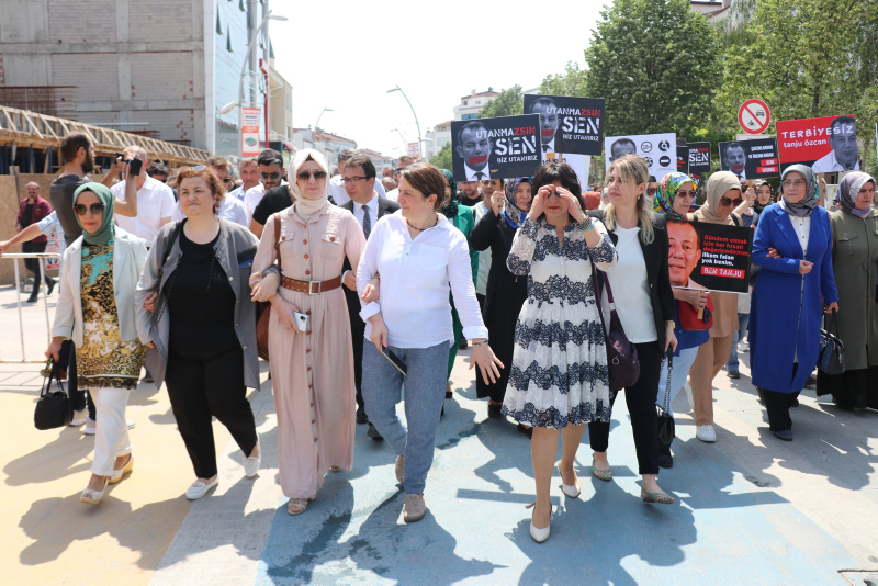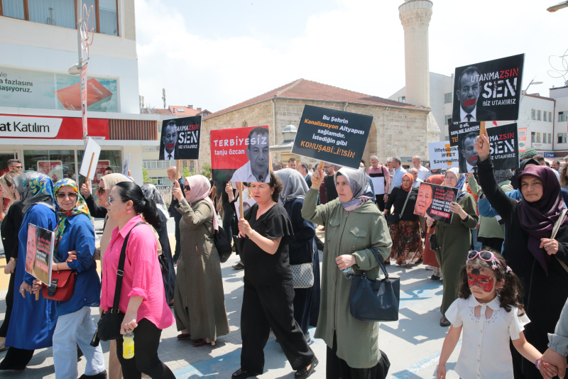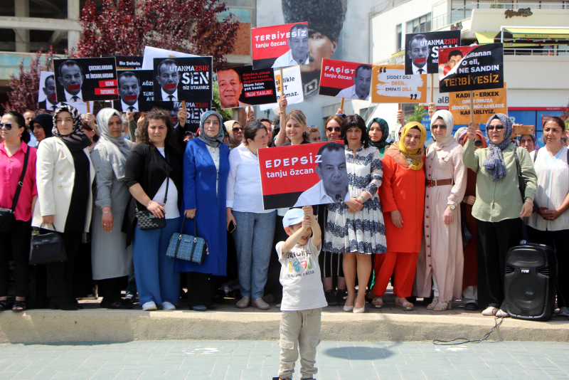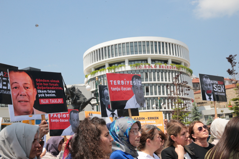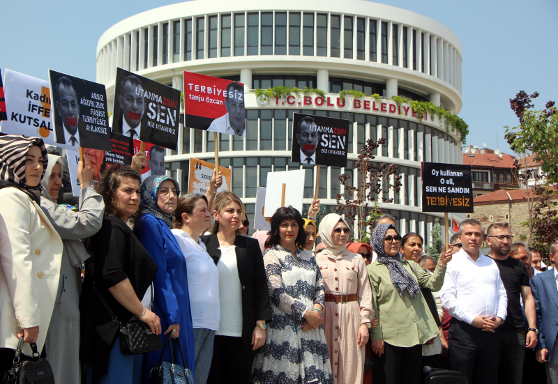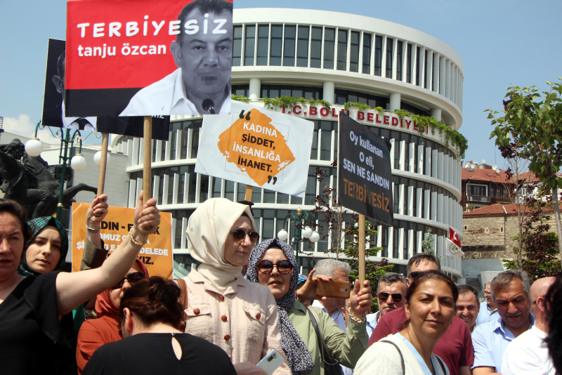 AK Parti Bolu İl Başkanı Suat Güner, partililer ve sivil toplum kuruluşu temsilcileri İzzet Baysal Caddesi'nde bulunan Kadı Camisi önünde toplandı. Yaklaşık 200 kadın, ellerinde dövizlerle Bolu Belediyesi önüne yürüdü. 'Utanmazsın sen', Terbiyesiz Tanju Özcan' yazılı dövizler taşıyan kadınlar Başkan Özcan'a tepki gösterdi.