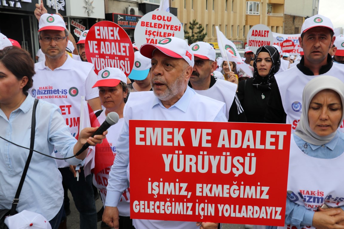 Hak-İş Konfederasyonuna bağlı Hizmet-İş Sendikasının, Bolu Belediyesindeki işten çıkarmaları protesto etmek amacıyla düzenlediği "Emek ve Adalet Yürüyüşü" başladı. Hak-İş Konfederasyonu Genel Başkanı Mahmut Arslan, burada yaptığı açıklamada "Ey Kılıçdaroğlu, adalet için, demokrasi için insan hakları için Ankara'dan İstanbul'a yürürken söylediklerin nerede kaldı. Ey Kılıçdaroğlu Mersin'de söylediğin taahhütler nerede kaldı, ey CHP milleti kandırarak milleti yalan yanlış taahhütlerle kandırarak aldığınız oyların hesabı sorulmayacak mı sandınız bunun hesabını soracağız onun için buradayız." dedi.