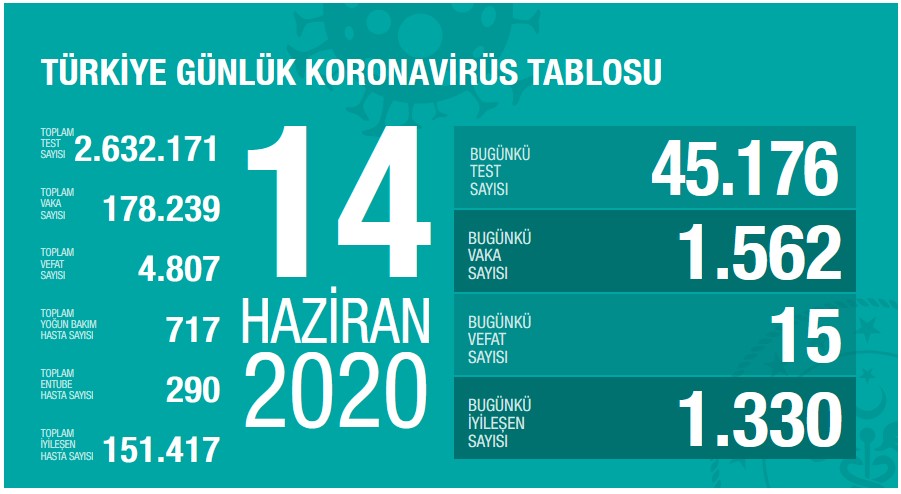Türkiye'de 14 Haziran 2020 tarihi itibarıyla toplam vaka sayısı 178.239 oldu. Koronavirüs nedeniyle 4.807 kişi hayatını kaybetti. Toplam yoğun bakım hasta sayısı 717, toplam entube hasta sayısı 290 olarak açıklanırken, 151.417 hastanın iyileştiği bildirildi.