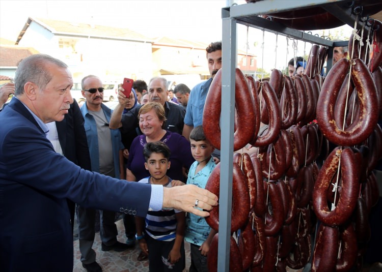 Vatandaşlarla hatıra fotoğrafı çektiren Erdoğan, ayrıca köylülerin ürettiği organik gıdaları ve ürünleri de inceledi.
