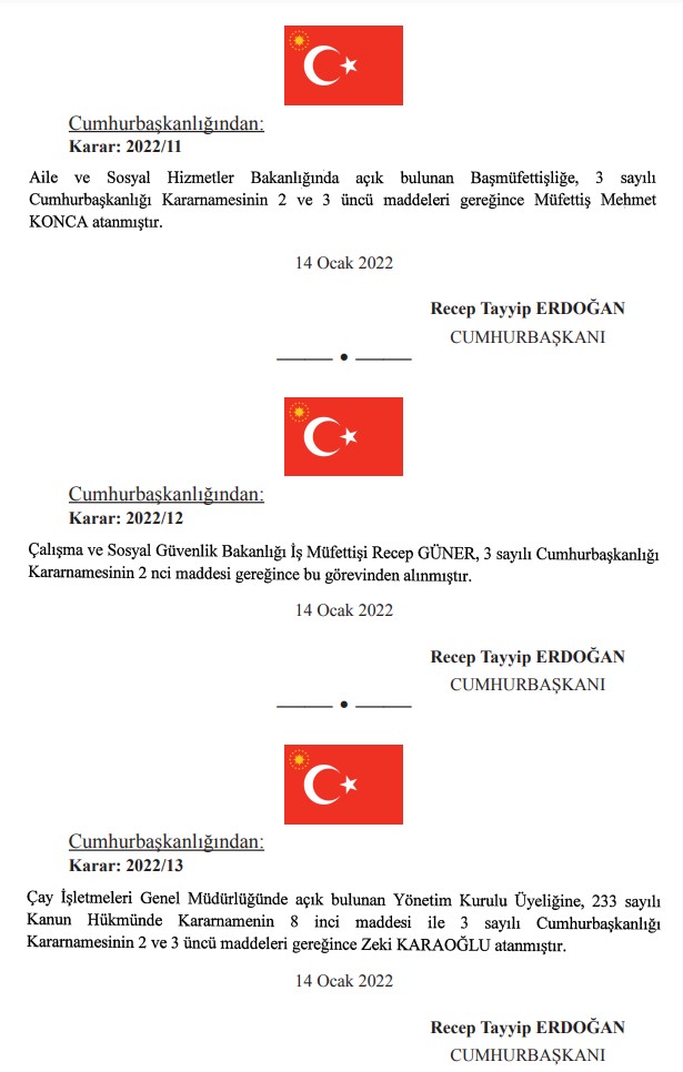 Başkan Recep Tayyip Erdoğan'ın imzasıyla Resmi Gazete'nin bugünkü sayısında yayımlanan kararlara göre; Aile ve Sosyal Hizmetler Bakanlığı Başmüfettişliğine Mehmet Konca atanırken, Çalışma ve Sosyal Güvenlik Bakanlığı İş Müfettişi Recep Güner görevinden alındı.