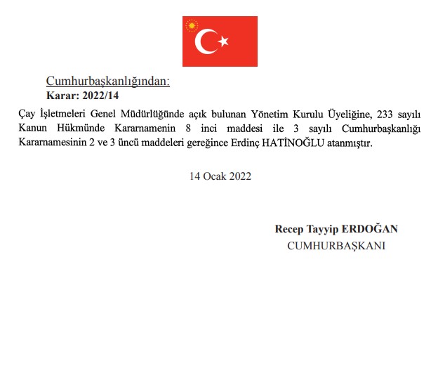 Çay İşletmeleri Genel Müdürlüğü (ÇAYKUR) Yönetim Kurulu Üyeliğine Zeki Karaoğlu ve Erdinç Hatinoğlu atandı.