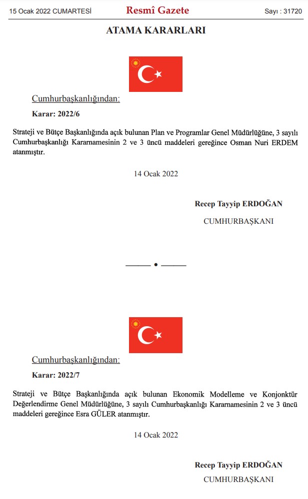 Son dakika haberi... Cumhurbaşkanlığı tarafından çeşitli kurum ve kuruluşlara yapılan atamalar Resmi Gazete'de yayımlandı. Aile ve Sosyal Hizmetler Bakanlığı, Çalışma ve Sosyal Güvenlik Bakanlığı, Çay İşletmeleri Genel Müdürlüğü (ÇAYKUR), Strateji ve Bütçe Başkanlığı, Ekonomik Modelleme ve Konjonktür Değerlendirme Genel Müdürlüğü, Sektörler ve Kamu Yatırımları Genel Müdürlüğü, Yönetim Hizmetleri Genel Müdürlüğü, Sektörler ve Kamu Yatırımları Genel Müdür Yardımcılına atamalar yapıldı. İşte o isimler...