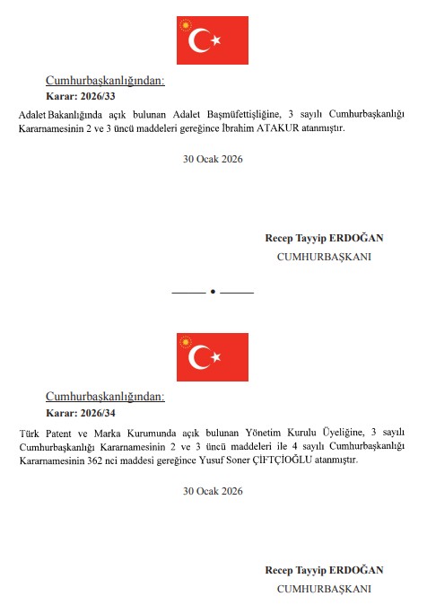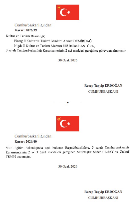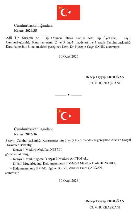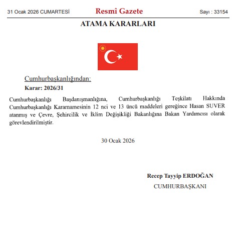 Başkan Recep Tayyip Erdoğan'ın imzasıyla yayımlanan atama kararları Resmi Gazete'de yürürlüğe girdi. Çevre, Şehircilik ve İklim Değişikliği Bakanlığı'nda üst düzey atama gerçekleştirildi.