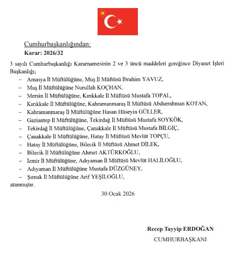 Başkan Recep Tayyip Erdoğan'ın imzasıyla yayımlanan atama kararları Resmi Gazete'de yürürlüğe girdi. Çevre, Şehircilik ve İklim Değişikliği Bakanlığı'nda üst düzey atama gerçekleştirildi. Buna göre Çevre Şehircilik ve İklim Değişikliği Bakanlığı Bakan Yardımcılığına Hasan Unver atandı. Öte yandan Diyanet İşleri Başkanlığı bünyesinde 13 ilin müftüsü değişti.