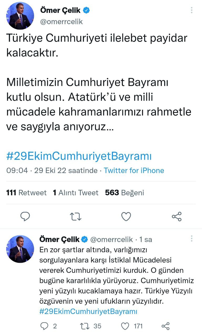 "Güçlü ve büyük bir liderlik, Şehit ve Gazilerimizin fedakarlığı ve köklü bir medeniyetin gücüyle kurulan birilerinin '10 yıl yaşayamaz.' dediği güzel Cumhuriyet'imizin 99. yıl dönümünü kutlamanın heyecanı, mutluluğu ve gururu içindeyiz. Millet olmak, bir yolculuktur. 2 bin 200 yıllık devlet tarihimizin belki 100 yıllık bir etabını tamamlıyoruz ama şurası kesindir ki; tamamladığımız bu yüzyıl özeldir; Kurtuluş Savaşı'nı verdiğimiz, ay yıldızlı bayrağımızı göklere çektiğimiz, İstiklal Marşı'mızı yazdığımız birinci yüzyılımız özeldir; 16 yıldızın ortasında Türkiye Cumhuriyeti'ni simgeleyen güneş özeldir, tektir ve Aziz Milletimizin, kıyamete kadar dünyanın üzerinde kalacak imzasıdır. Şimdi yeni bir yola çıkmaya hazırlanıyoruz. 21. yüzyılın başından itibaren Cumhurbaşkanımız Recep Tayyip Erdoğan liderliğinde hazırlandığımız 'Türkiye Yüzyılı', bugün belki sadece bize ait bir tanım olabilir ama inanıyoruz ki çok kısa sürede dünyanın da tasdik ettiği, kullandığı ve bugün merhametsizlik ve güvensizlik girdabında boğulan insanlık için umut ışığı aradığı bir ifade ve bir iklim olacaktır. Türkiye; savunma sanayi ürünleriyle, dünyaya örnek olan göç yönetimiyle, insanlığa umut olan terör ve uyuşturucu mücadelesiyle, vesayet yapılarını bertaraf ederek ulaştığı demokrasi standartlarıyla, yerli otomobilinden yerli uçağına kadar belirlediği ve ulaştığı her hedefte, bize 29 Ekim 1923'ü armağan edenlere layık olduğunu, onların hayallerinden ve ideallerinden ayrılmadığını tekrar tekrar ispat etmektedir. Bu vesileyle, Kurtuluş Savaşı'mızın Başkomutanı ve Güzel Cumhuriyet'imizin kurucusu Gazi Mustafa Kemal Atatürk başta olmak üzere bu büyük yolculuğa emek vermiş tüm geçmiş büyüklerimizi, Şehit ve Gazilerimizi, rahmet ve şükranla yad ediyor, Aziz Milletimizin Cumhuriyet Bayramı'nı en içten dileklerimle ve coşkuyla kutluyorum."