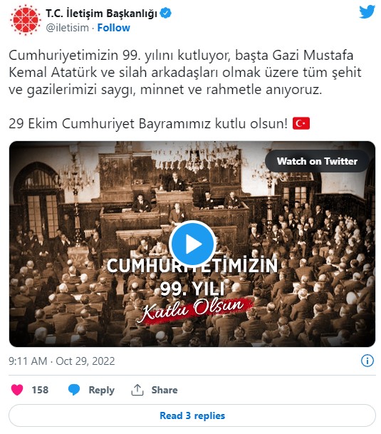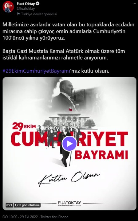Cumhuriyetin ilan edilişinin 99'uncu yıl dönümünü kutladığımız bugün, millet olarak bizim iftihar günümüzdür. Bu vesileyle kurtarıcı ve kurucu Meclisimizin ilk Başkanı ve ilk Cumhurbaşkanı Gazi Mustafa Kemal Atatürk'ü, Milli Mücadele'nin kahramanlarından müteşekkil Birinci Dönem ile Cumhuriyet'imizi ilan eden Türkiye Büyük Millet Meclisinin ikinci dönem milletvekilleri başta olmak üzere milletimize ve devletimize hizmet etmiş bütün siyaset ve devlet adamlarımızı, aziz vatanımızı bizlere emanet eden kahraman şehitlerimizi ve vefat etmiş gazilerimizi rahmet, minnet ve şükranla anıyorum."