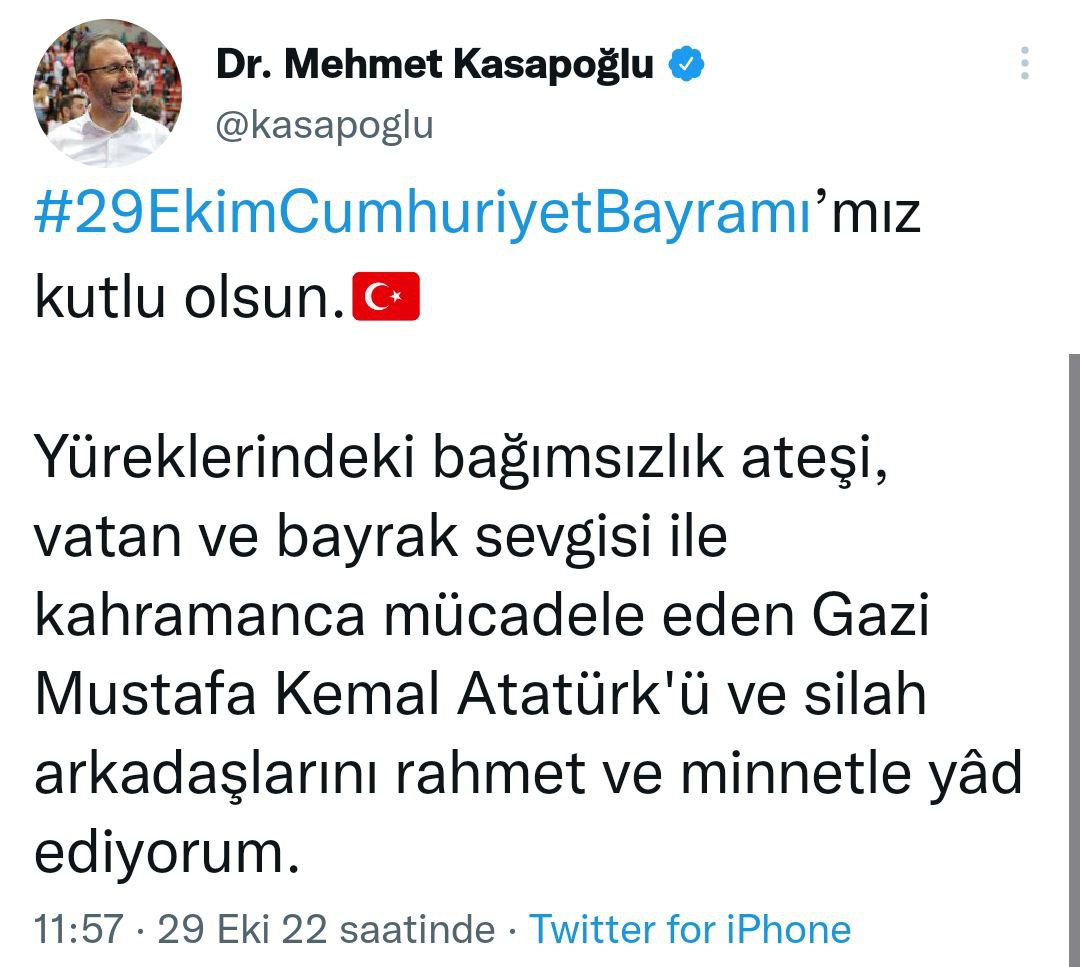 Büyük eğitim ailemizin neferleri olarak karakterinde kahramanlık, idealinde hürriyet, davasında insaniyet olan bir milletin çocuklarına hizmet etmekten kıvanç duyuyoruz. Cumhuriyet'imizin banisi Gazi Mustafa Kemal Atatürk ve tüm aziz şehitlerimizi saygıyla yad ediyor, 29 Ekim Cumhuriyet Bayramı'nızı kutluyorum."