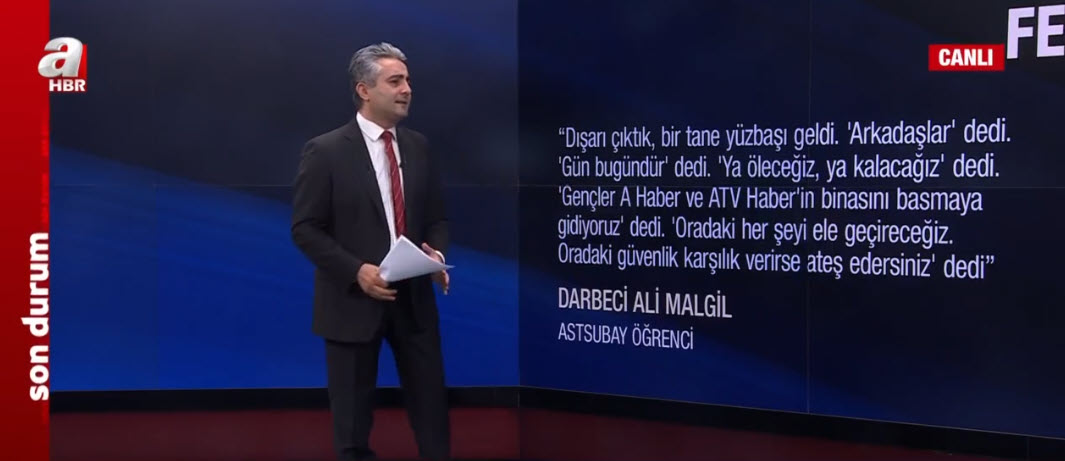 Darbeci Ali Malgil: "Dışarı çıktık, bir tane yüzbaşı geldi. 'Arkadaşlar' dedi. 'Gün bugündür' dedi. 'Ya öleceğiz, ya kalacağız' dedi. 'Gençler A Haber ve ATV Haber'in binasını basmaya gidiyoruz' dedi. 'Oradaki her şeyi ele geçireceğiz. Oradaki güvenlik karşılık verirse ateş edersiniz' dedi.