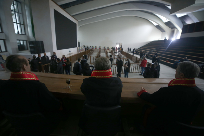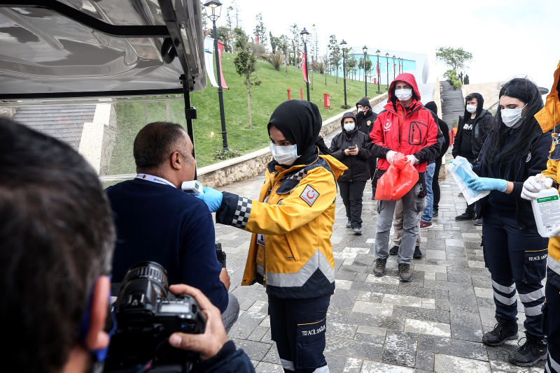 Basın mensupları güvenlik kontrolünden geçtikten sonra, yeni tip koronavirüs (Kovid-19) tedbirleri kapsamında ateşleri ölçülerek, sağlık görevlilerince kendilerine verilen maskeleri taktı.
