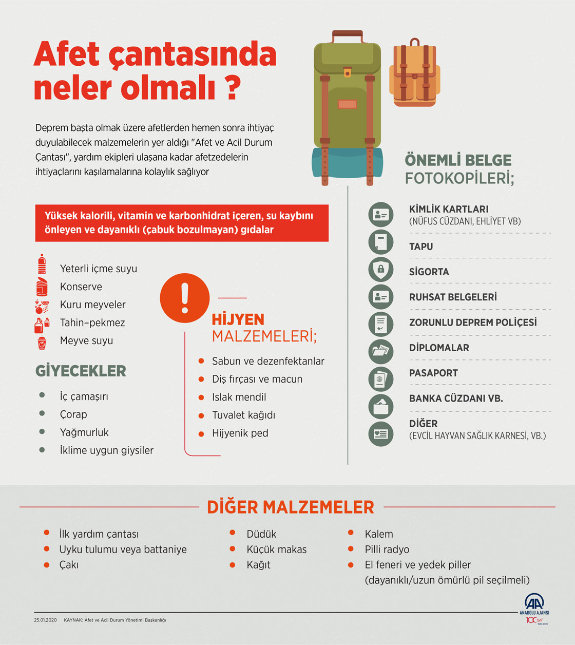 Bir afet sonrası yiyecek, içecek ve acil ihtiyaçları temin edebileceğiniz yerlere ulaşamayabilirsiniz. Küçük yaralanmalarınız varsa bunları kendiniz giderebilirsiniz. Bu tip durumlar için afet çantanızın içinde olması gerekenleri doğru belirleyip, çantanızı kolay ulaşacağınız bir yerde saklamanız çok önemlidir. Afet ve Acil Durum Çantası sadece evinizde, iş yerinizde değil okulunuzda, sınıfınızda da olmalıdır.