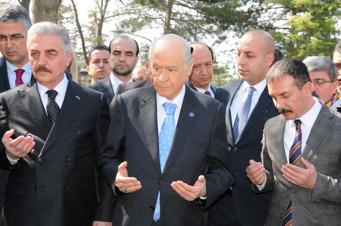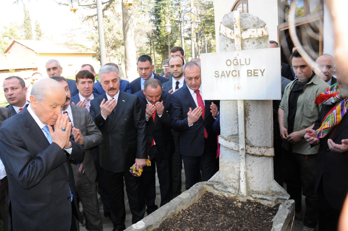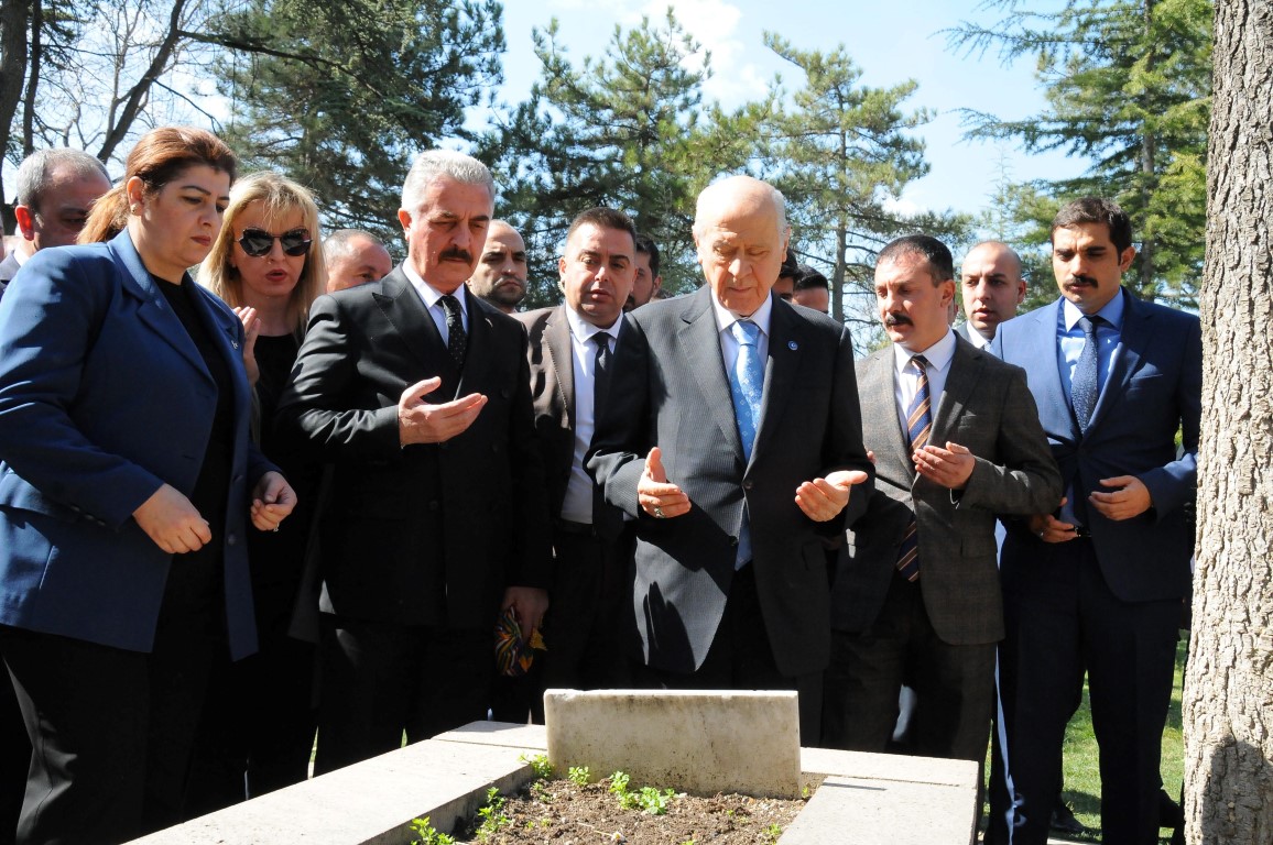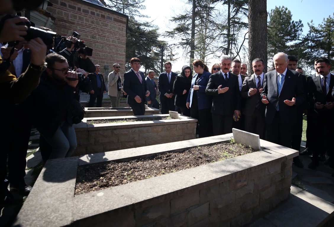 Bahçeli türbe ziyaretinin ardından Ertuğrul Gazi türbesi arkasında bulunan diğer mezarları tek tek dolaşarak dua etti.