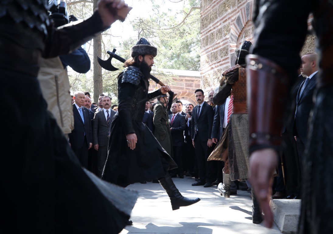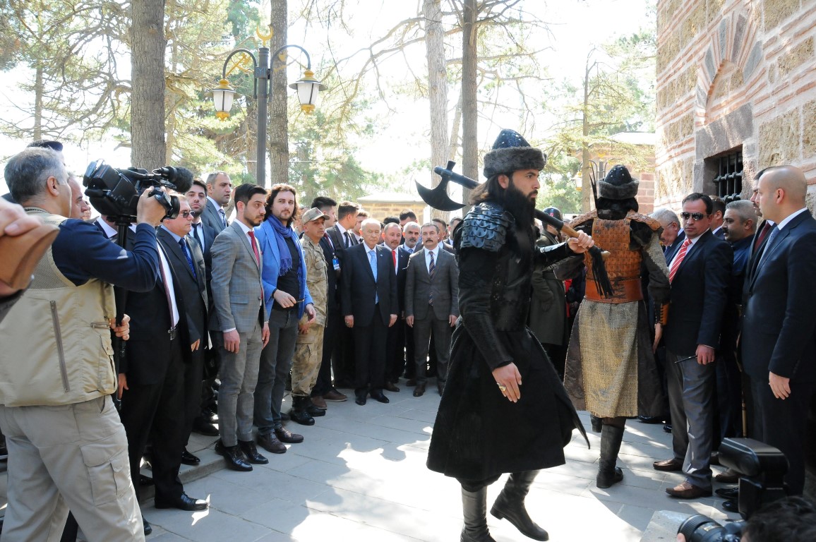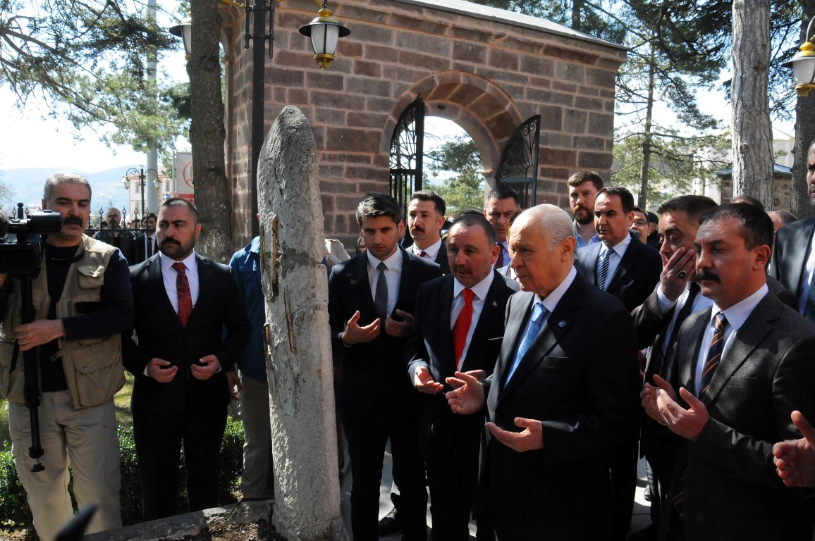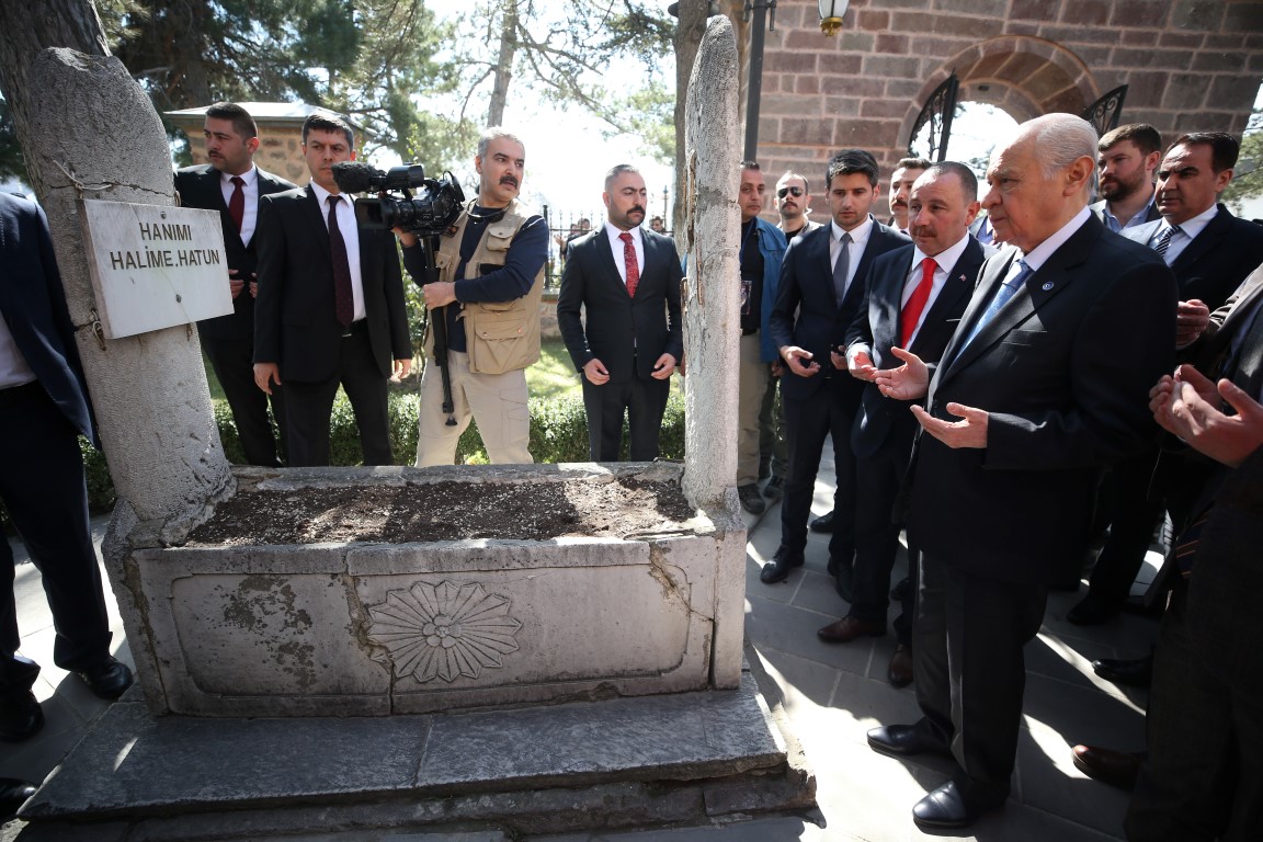 Partililer tarafından yoğun ilgiyle karşılanan Bahçeli, Söğüt'te yapacağı miting öncesinde Osmanlı Devleti'nin kurucusu Osman Bey'in babası Ertuğrul Gazi Türbesi'ne gitti.