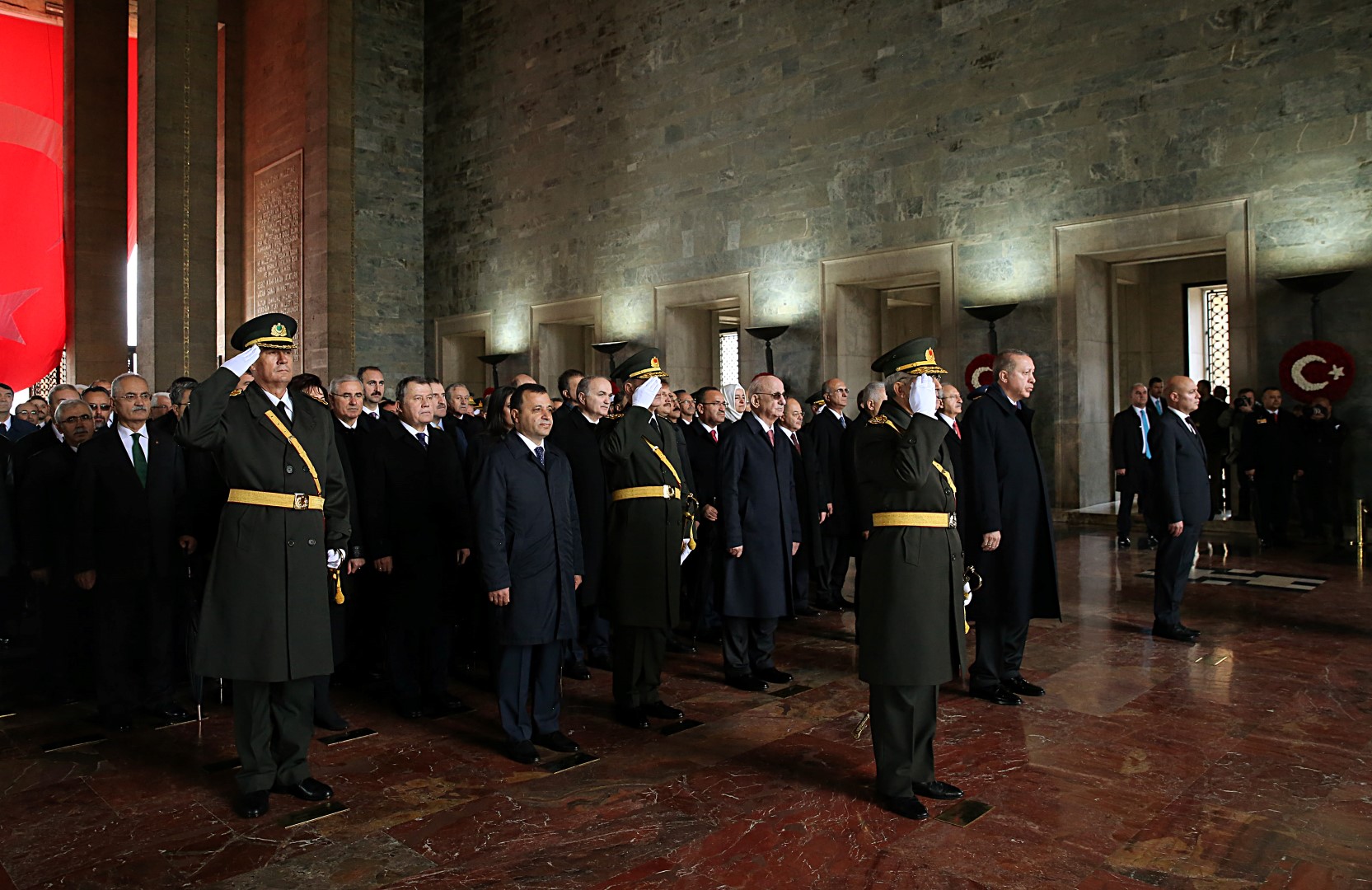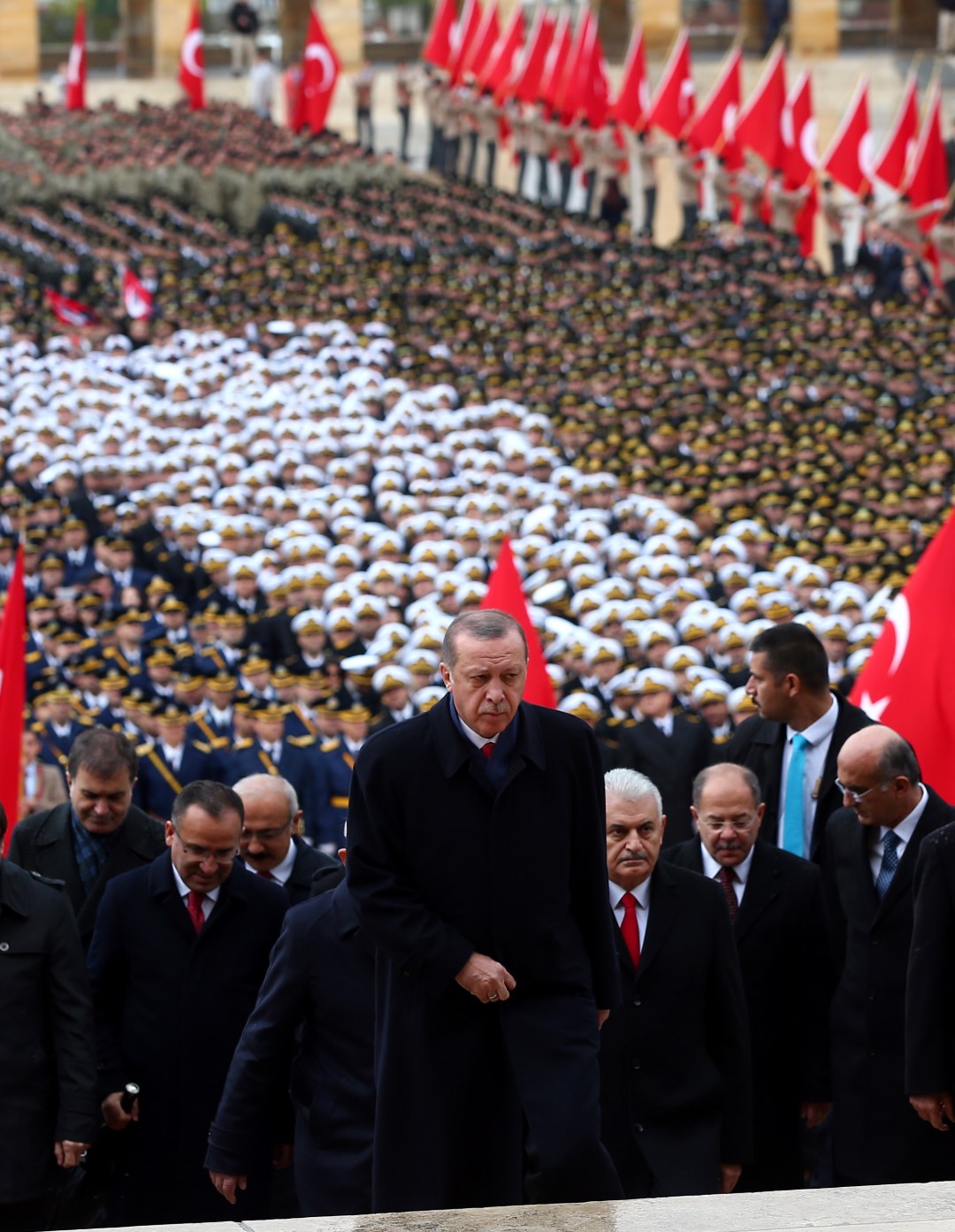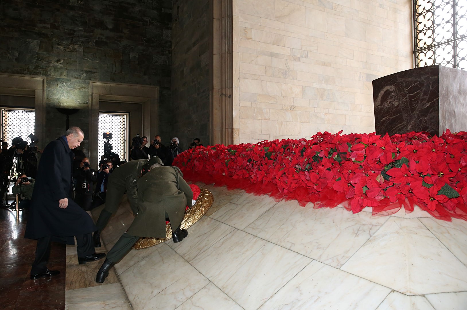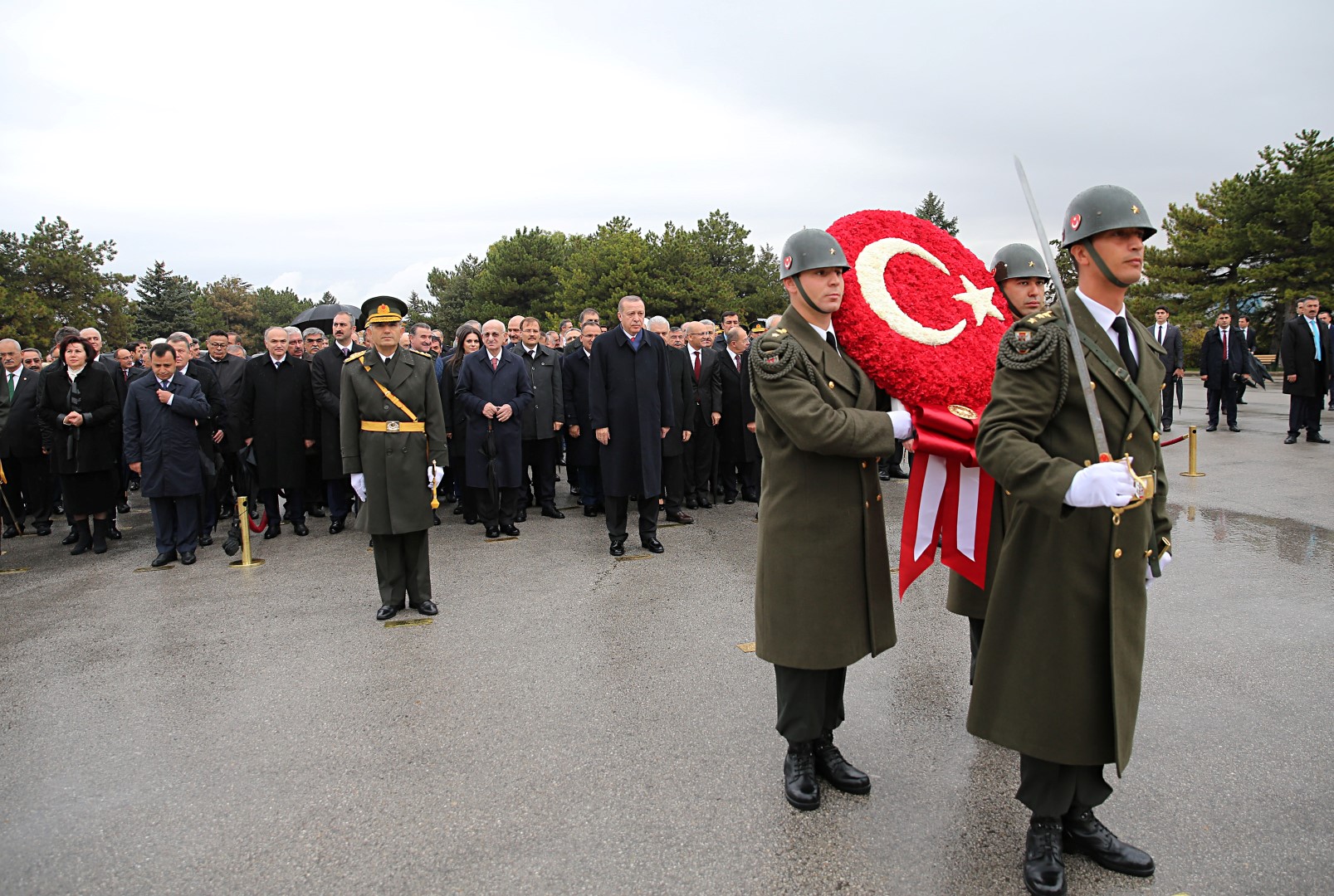 Cumhurbaşkanı Erdoğan ve beraberindekiler Aslanlı Yol'dan geçerek, Atatürk'ün mozolesine geldi. Erdoğan'ın, üzerinde ay yıldız bulunan çelengi Atatürk'ün mozolesine bırakmasının ardından saygı duruşunda bulunuldu, İstiklal Marşı okundu.