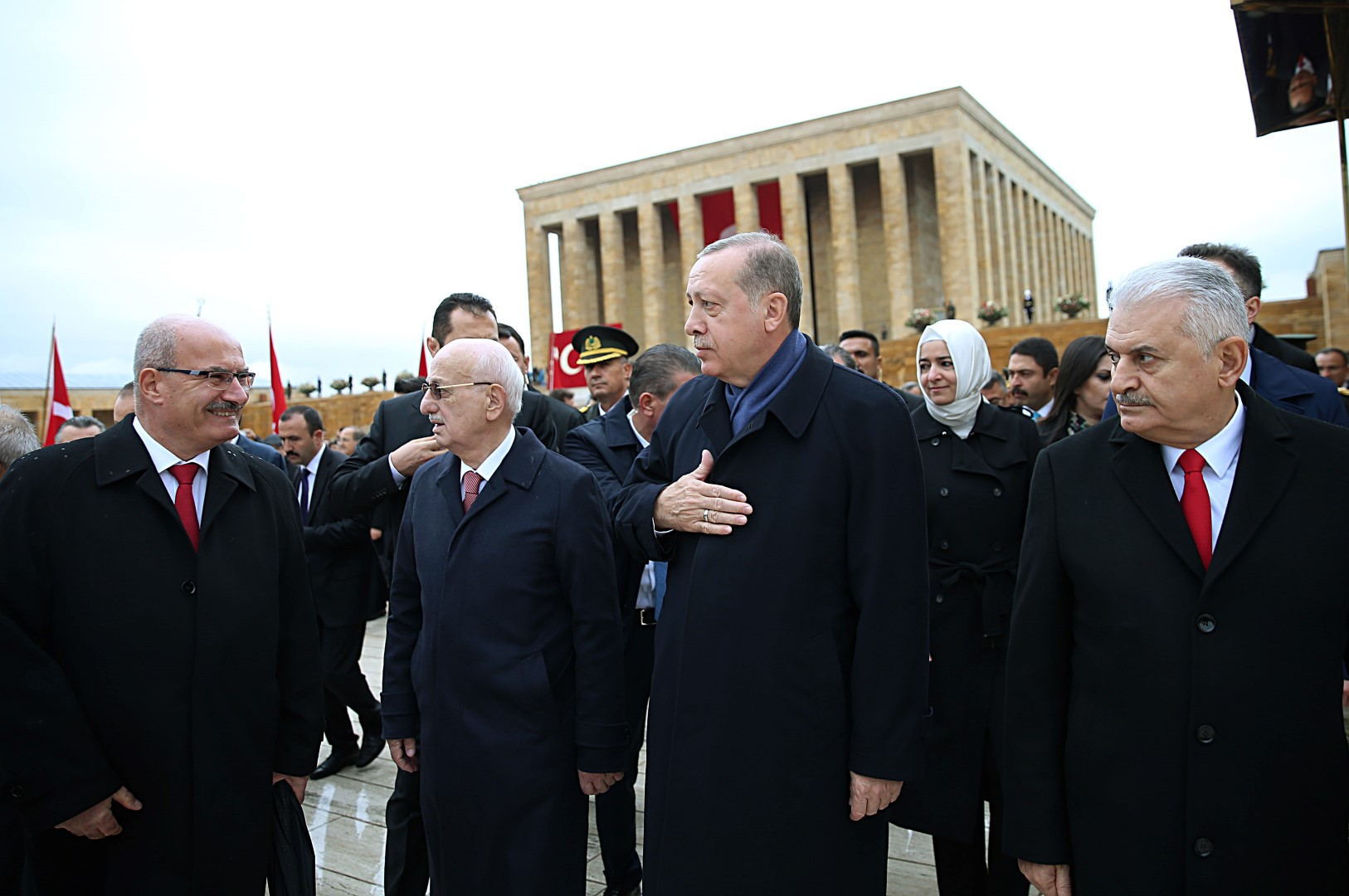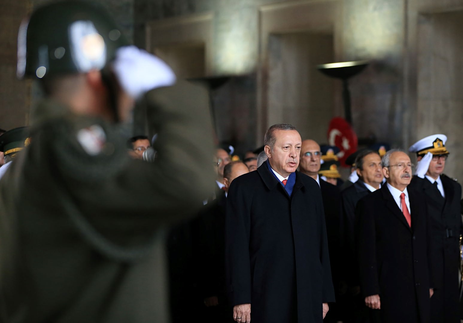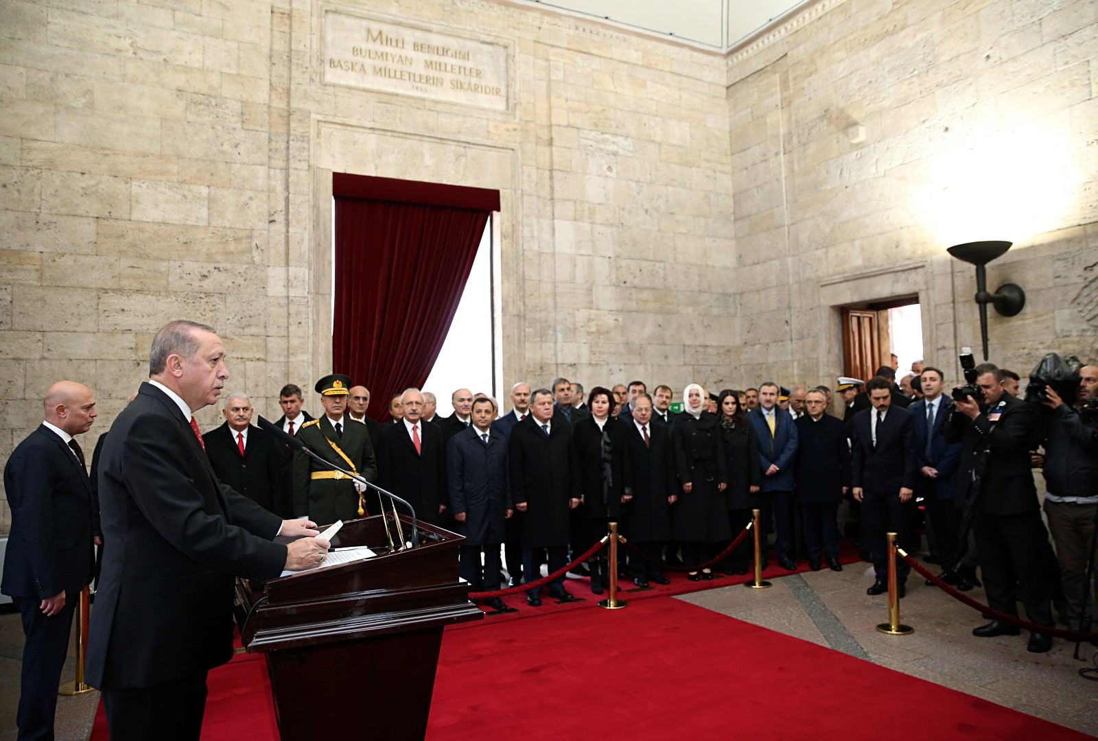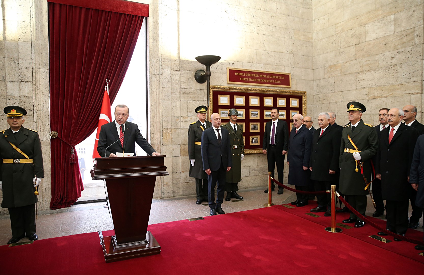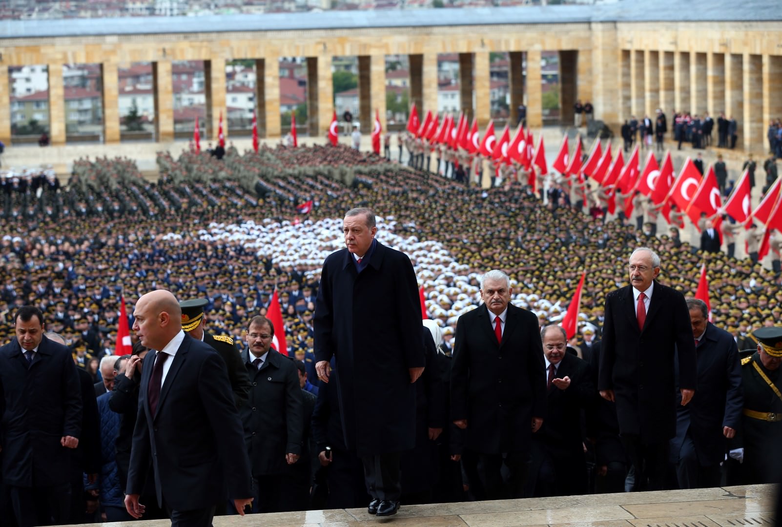 Cumhurbaşkanı Erdoğan ve beraberindekiler Aslanlı Yol'dan geçerek, Atatürk'ün mozolesine geldi. Erdoğan'ın, üzerinde ay yıldız bulunan çelengi Atatürk'ün mozolesine bırakmasının ardından saygı duruşunda bulunuldu, İstiklal Marşı okundu.