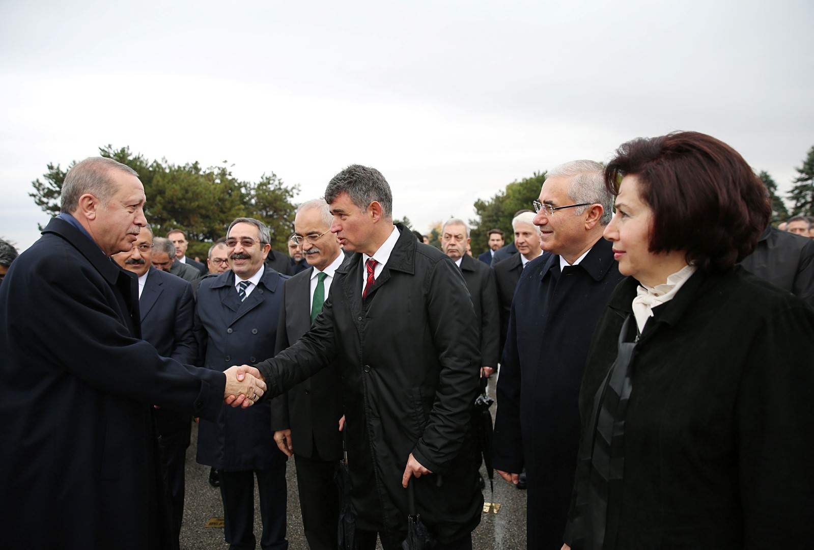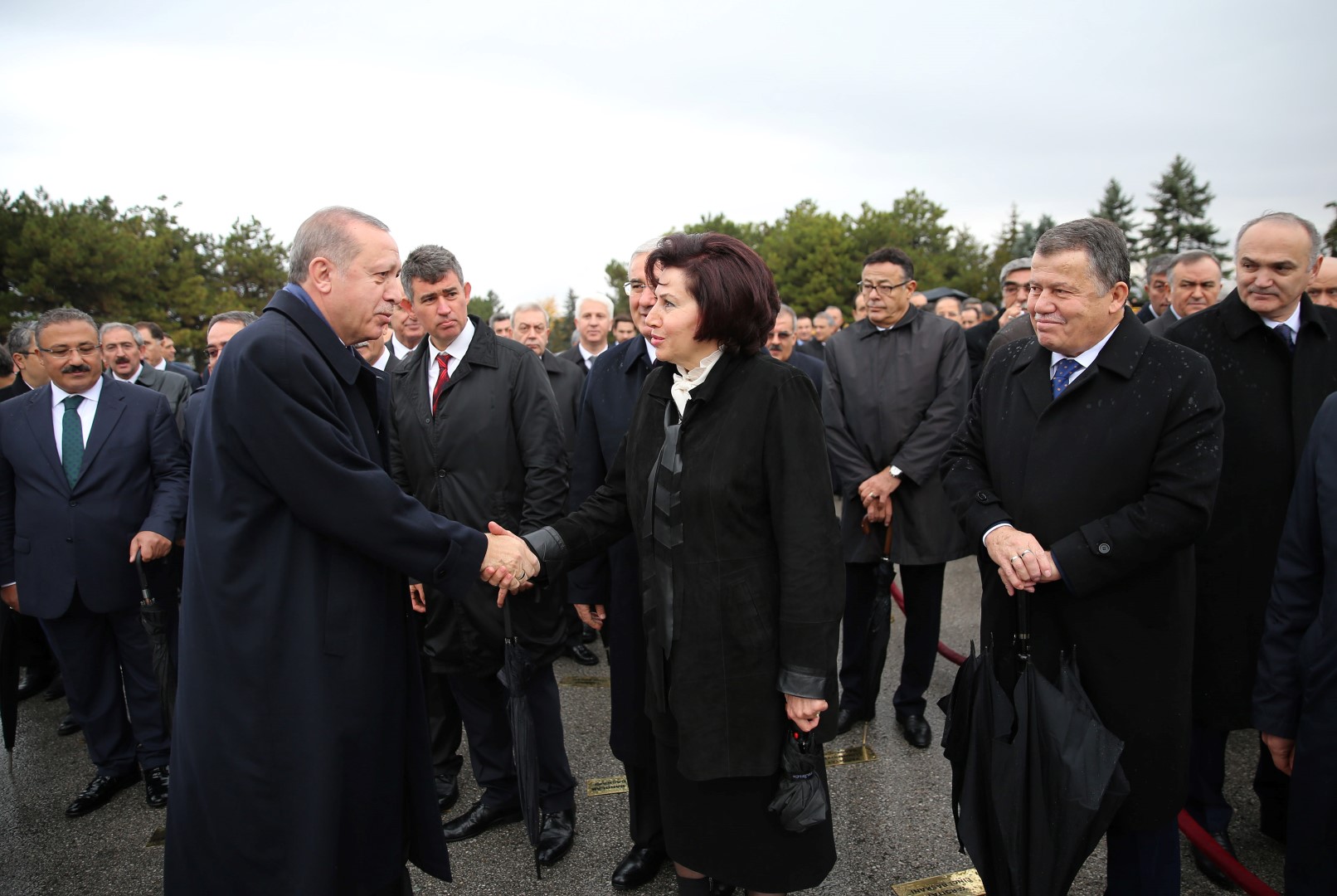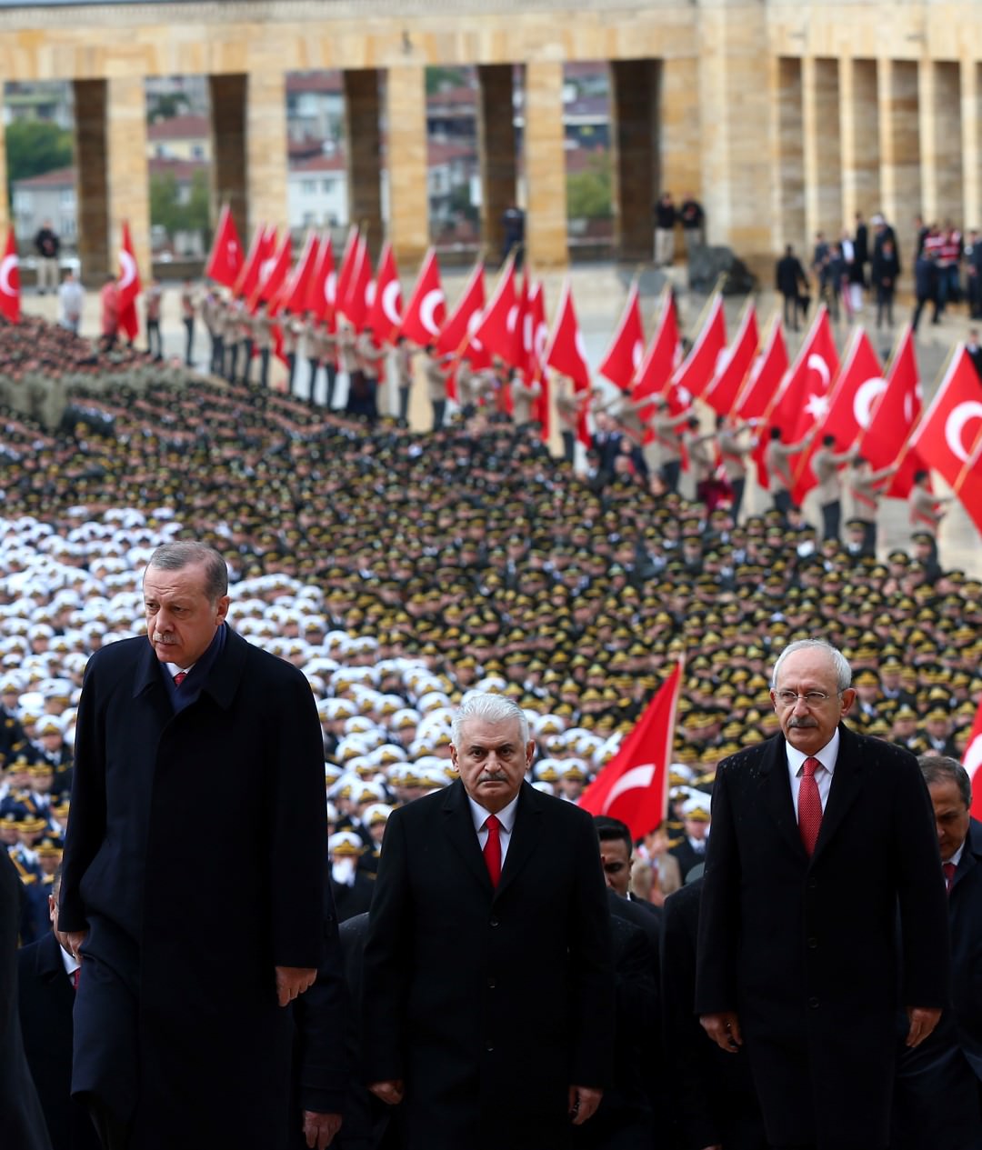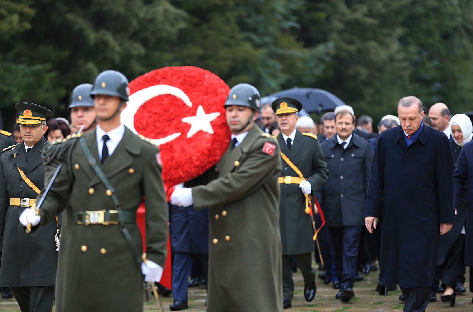 Cumhurbaşkanı Erdoğan ve beraberindekiler Aslanlı Yol'dan geçerek, Atatürk'ün mozolesine geldi. Erdoğan'ın, üzerinde ay yıldız bulunan çelengi Atatürk'ün mozolesine bırakmasının ardından saygı duruşunda bulunuldu, İstiklal Marşı okundu.