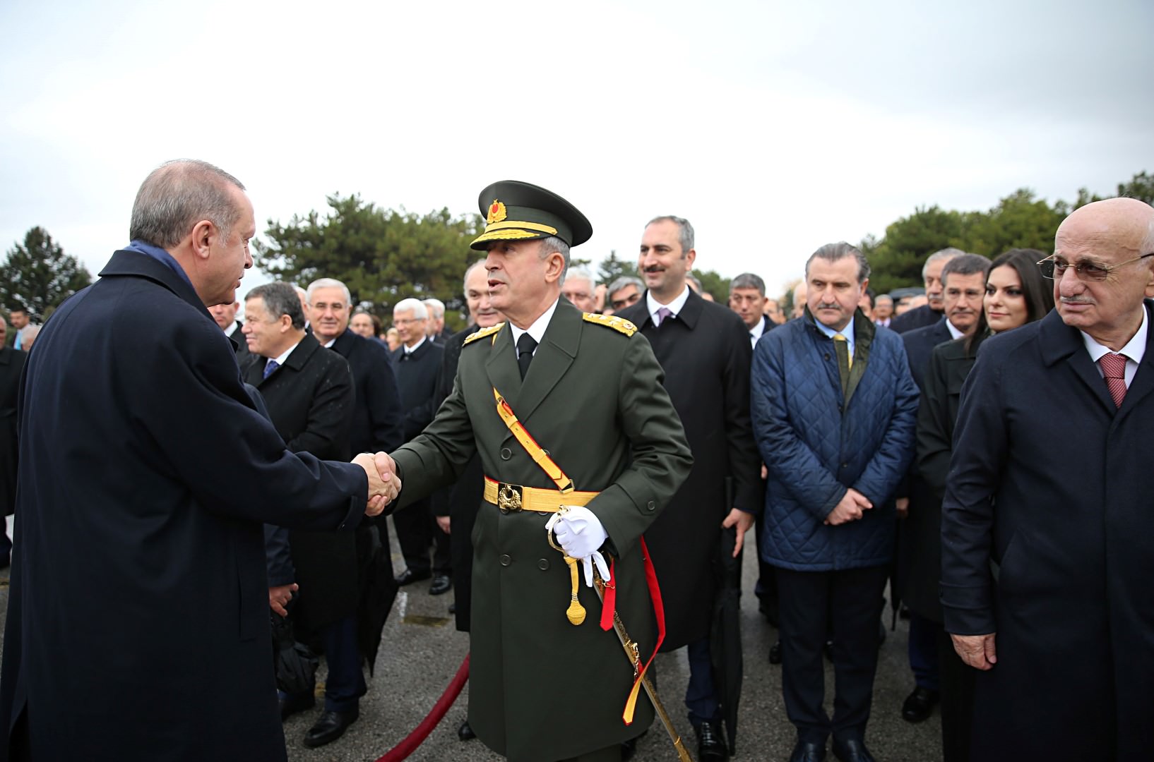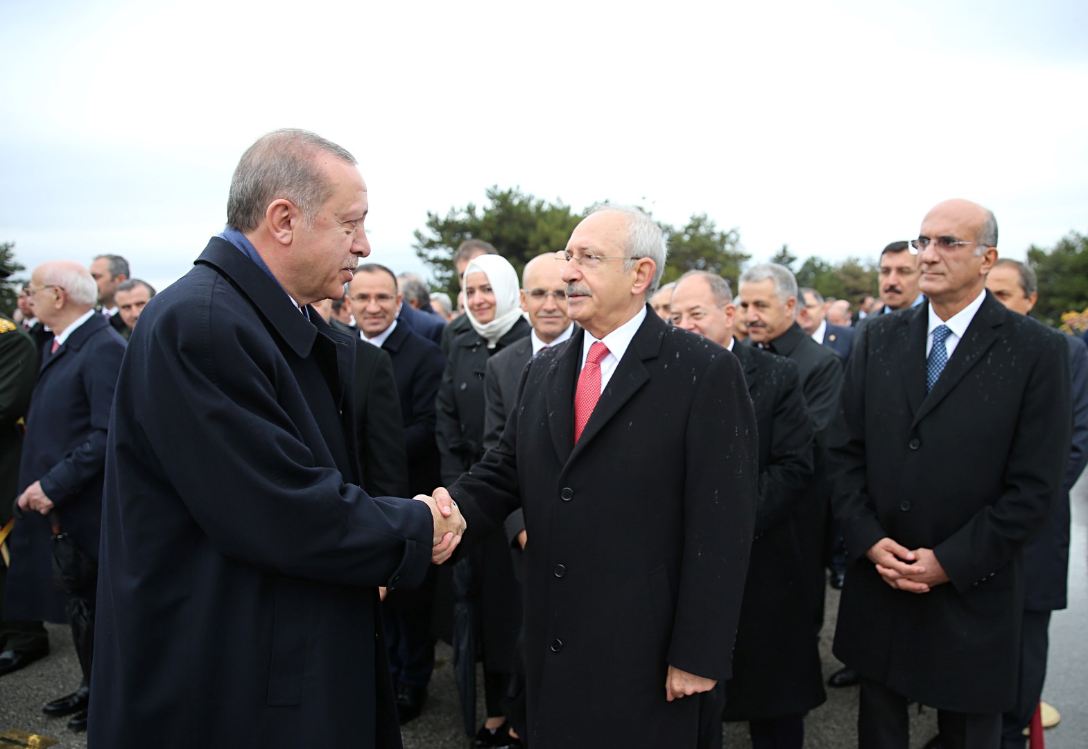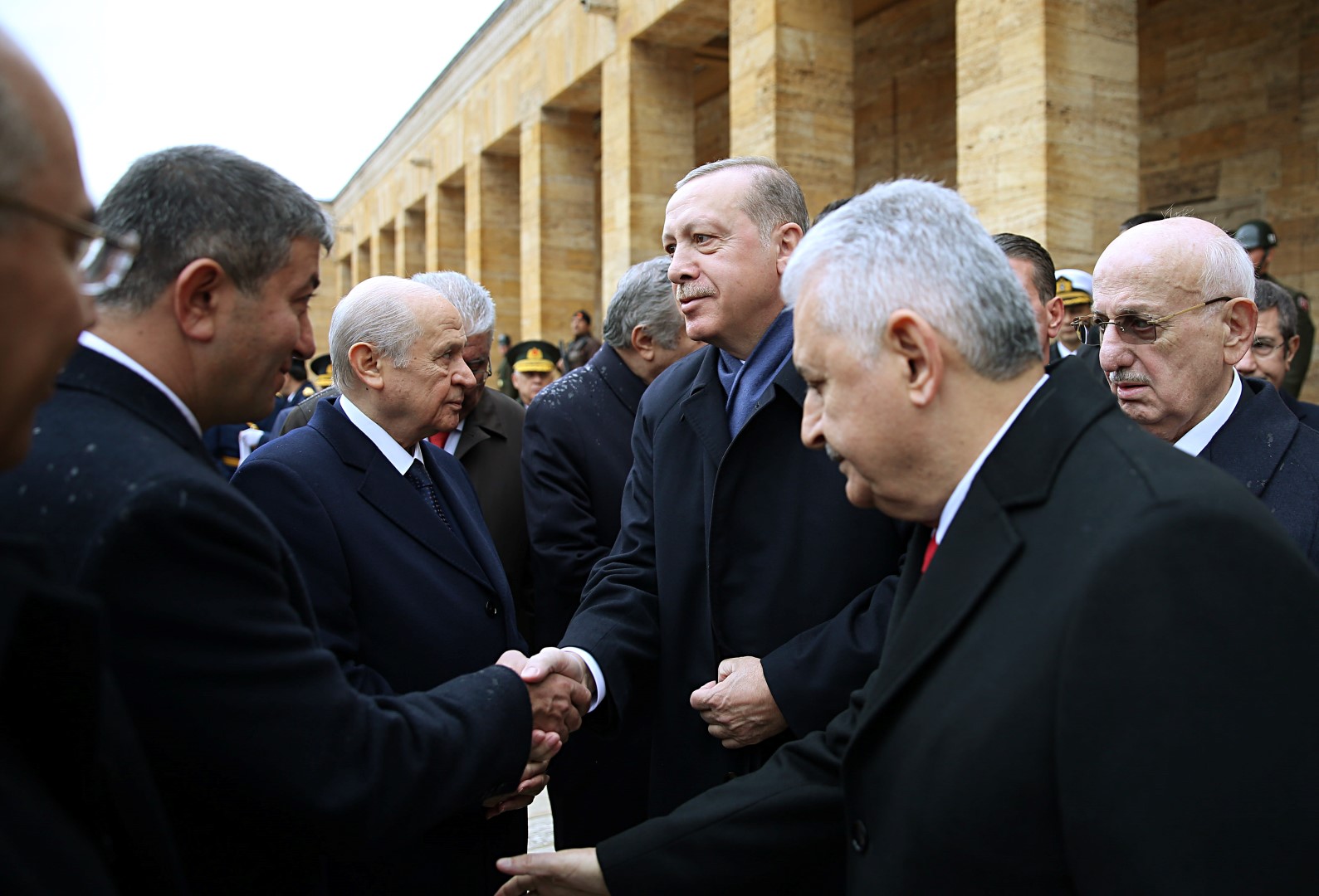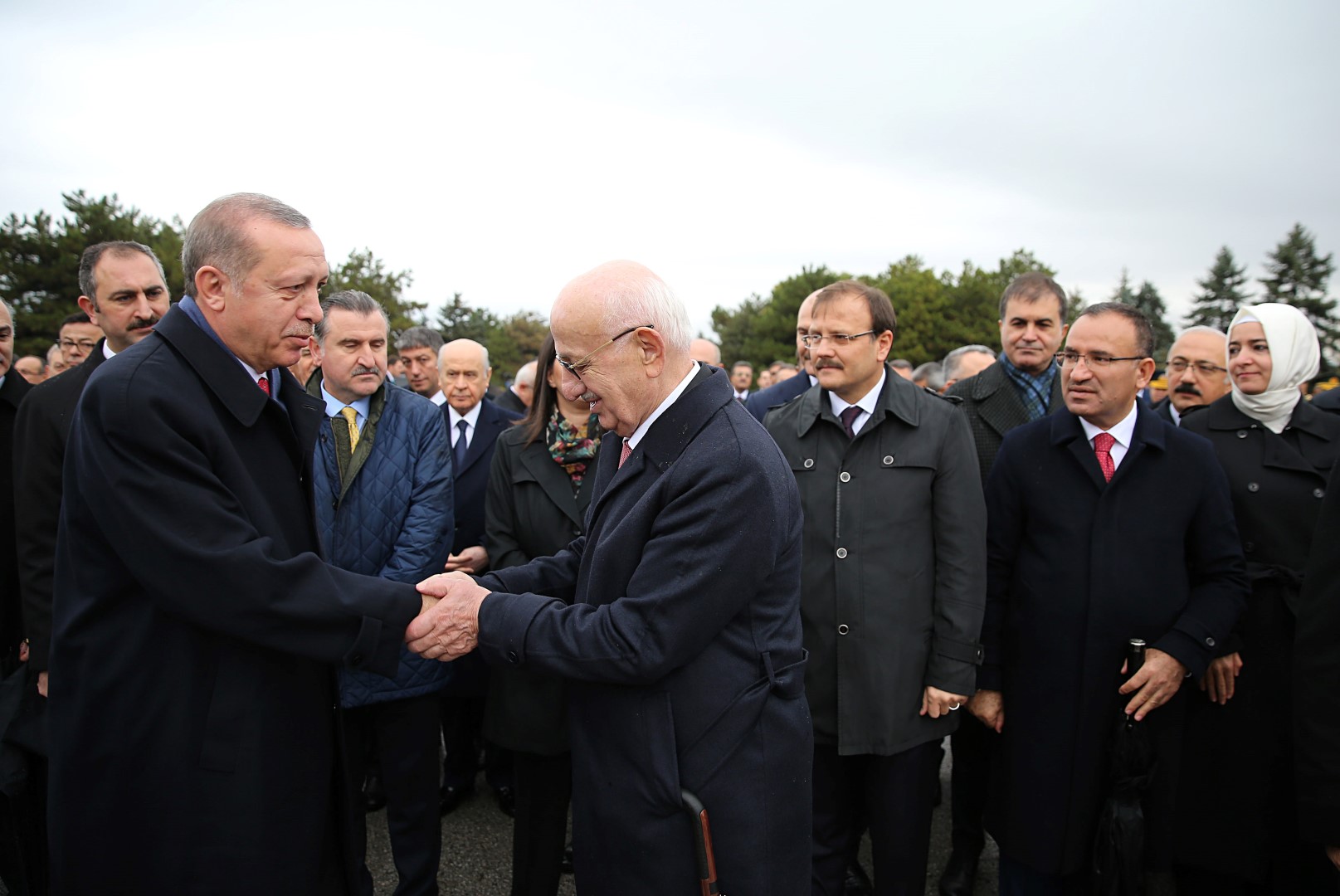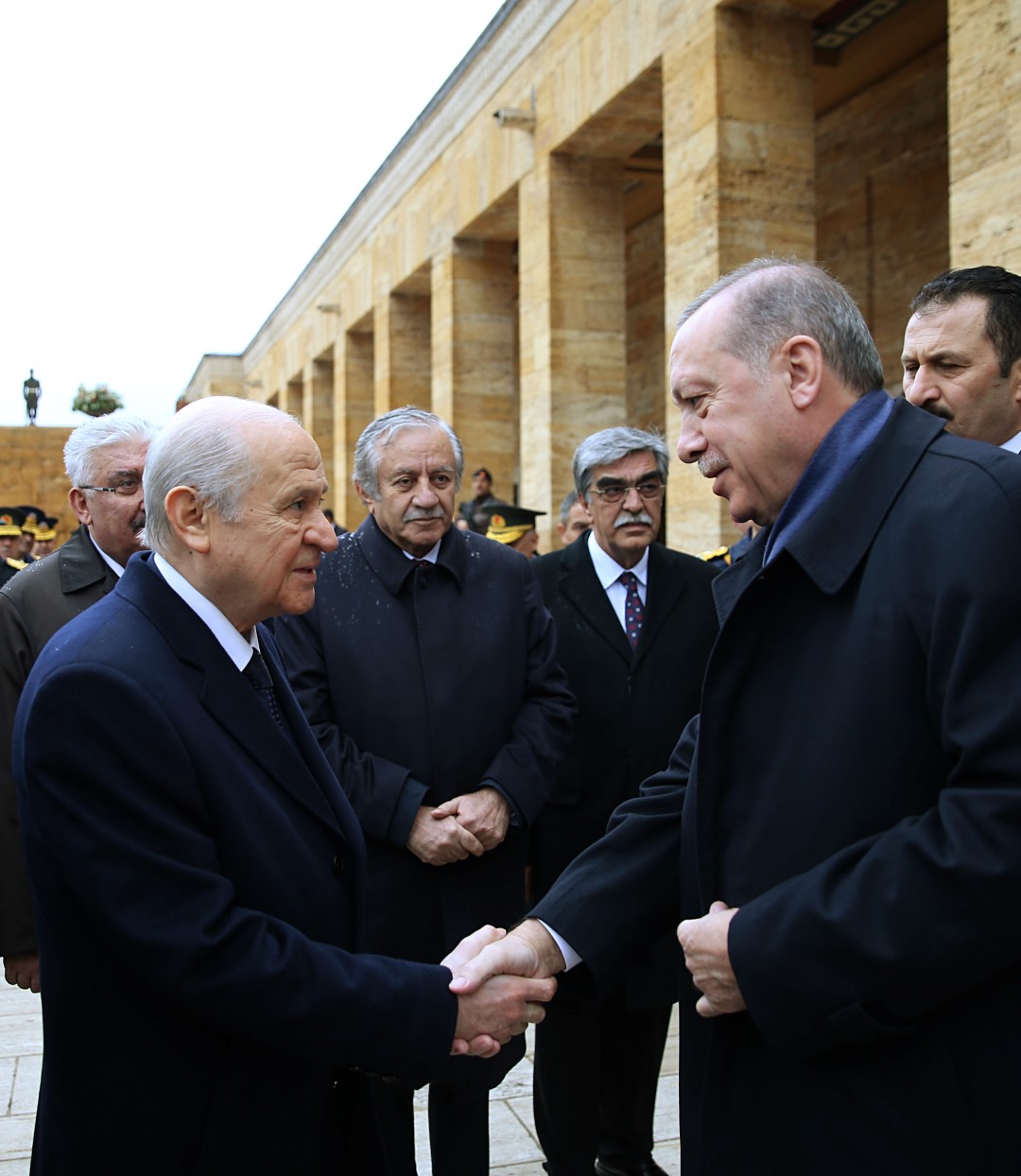 Cumhurbaşkanı Erdoğan ve beraberindekiler Aslanlı Yol'dan geçerek, Atatürk'ün mozolesine geldi. Erdoğan'ın, üzerinde ay yıldız bulunan çelengi Atatürk'ün mozolesine bırakmasının ardından saygı duruşunda bulunuldu, İstiklal Marşı okundu.