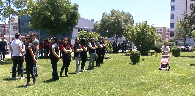 Ancak Büyükşehir Belediyesi önündeki yenileme çalışmaları nedeniyle kalabalık, Bağlar Belediyesi bahçesinde çadır kurarak eylem yapmaya karar verdi. Grubun basın açıklaması yaptığı sırada, belediyenin park görevlileri de bölgede çim makineleri ile çalışma yapmaya başladı.