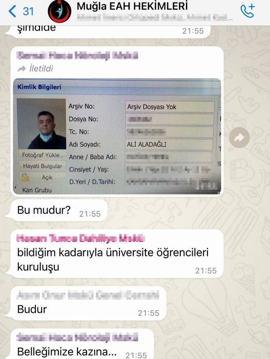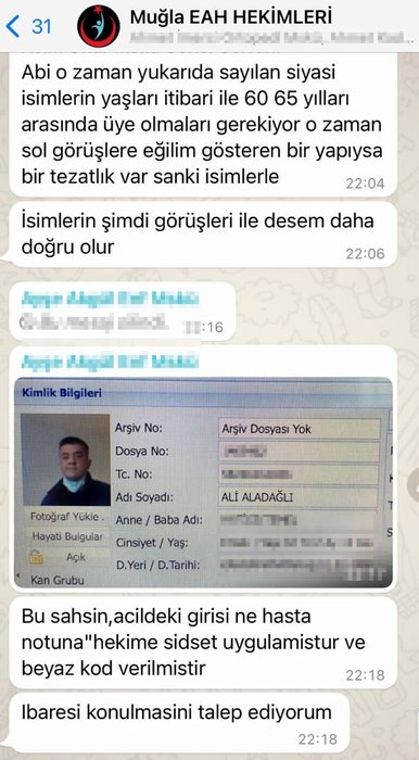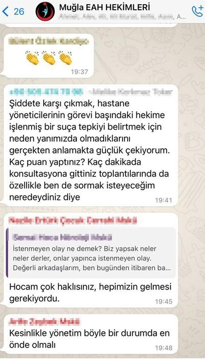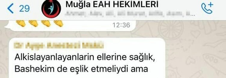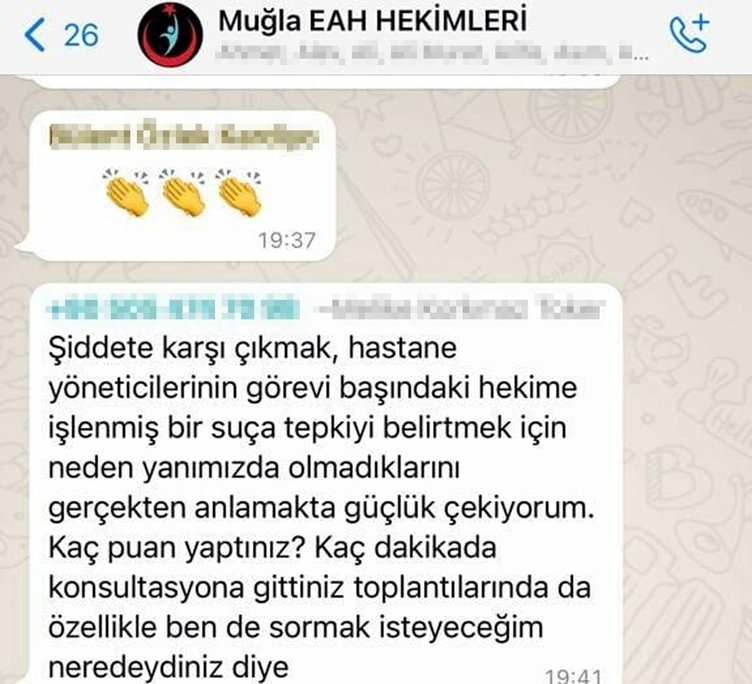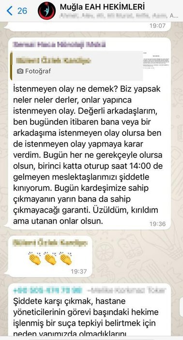 Muğla Eğitim ve Araştırma Hastanesi Başhekimliği, 14 Mart Tıp Bayramı'nda doktor Tahir Tarımer'i (26) darbetmediği belirlenen Uzman Çavuş Ali Aladağlı'yı (32), taburcu olurken alkışla protesto eden, aralarında doktorların da olduğu 25 kişiyi belirledi. İdari soruşturmada protestoya katıldıkları belirlenenlerin ifadelerinin alınacağı bildirilirken hastanede görevli doktorların, WhatsApp grubundaki yazışmalar ortaya çıktı.