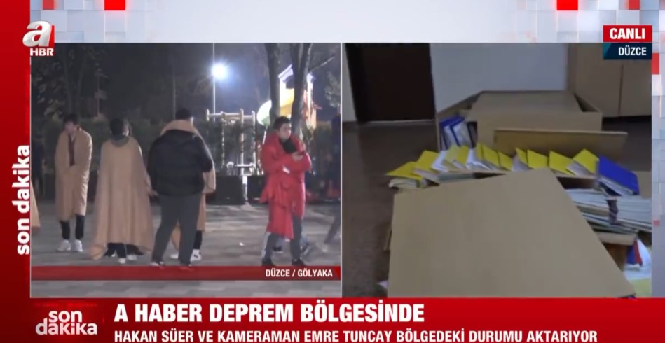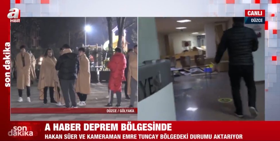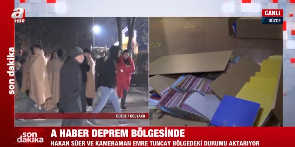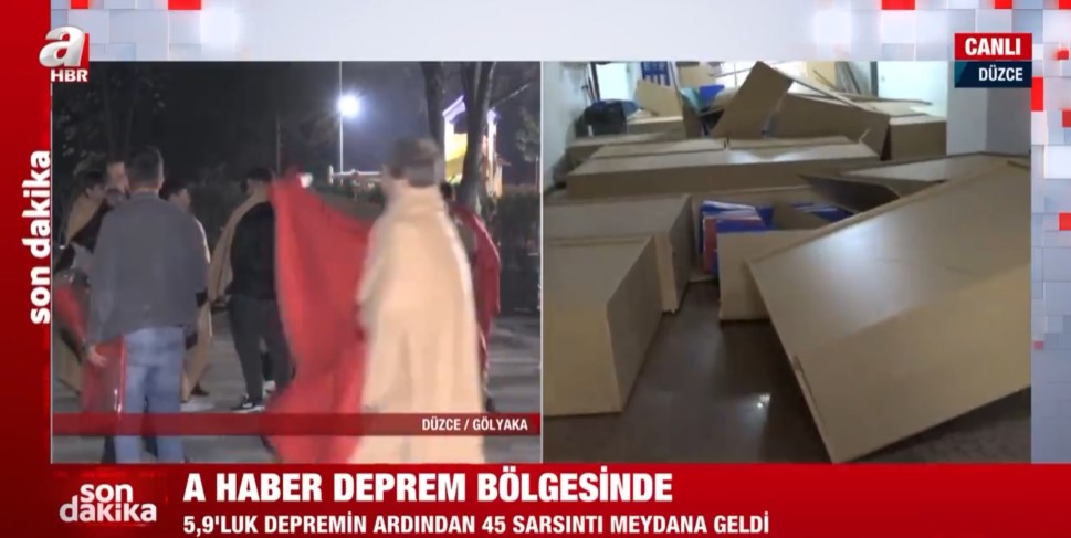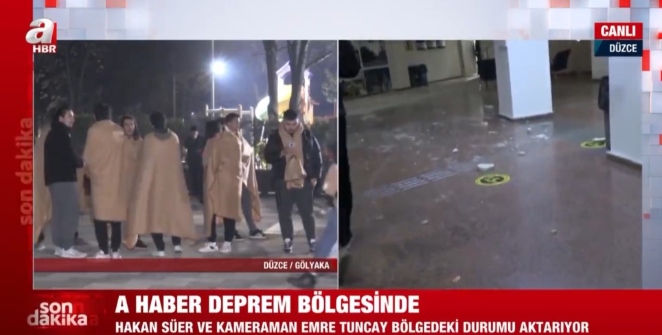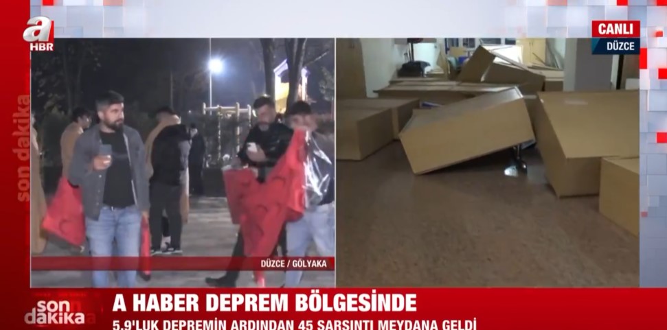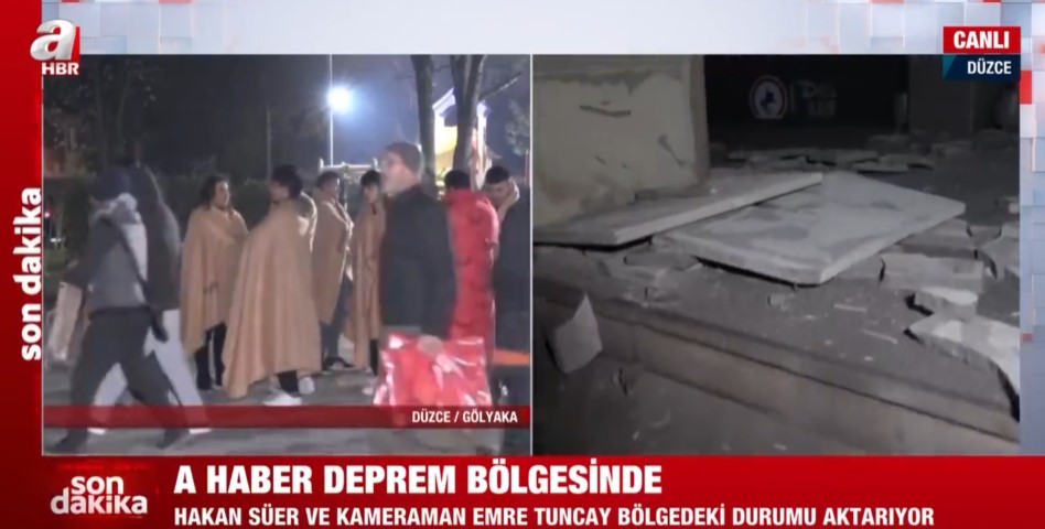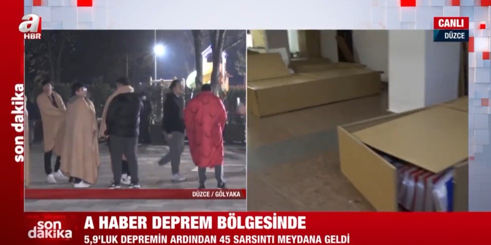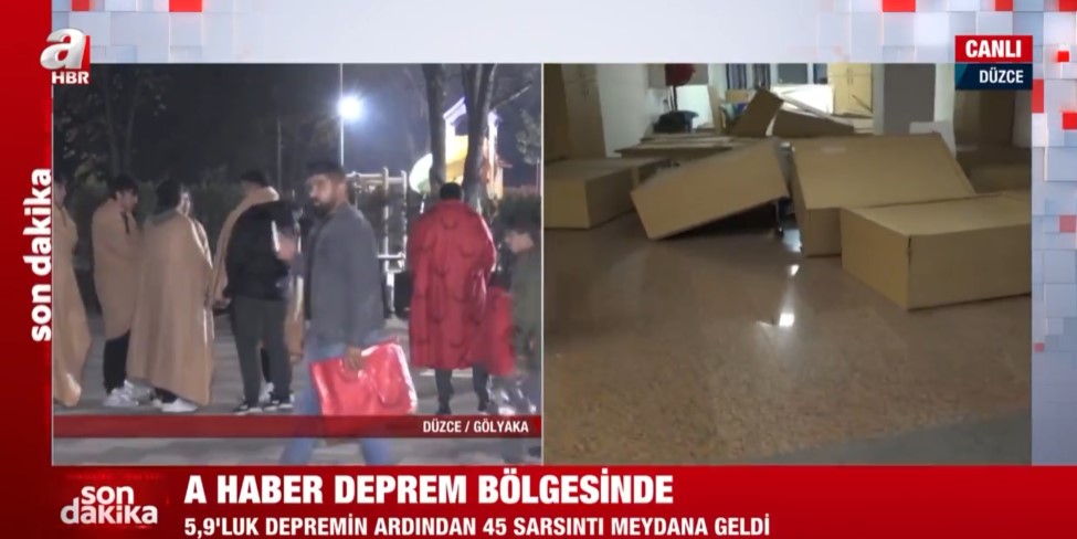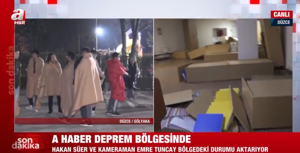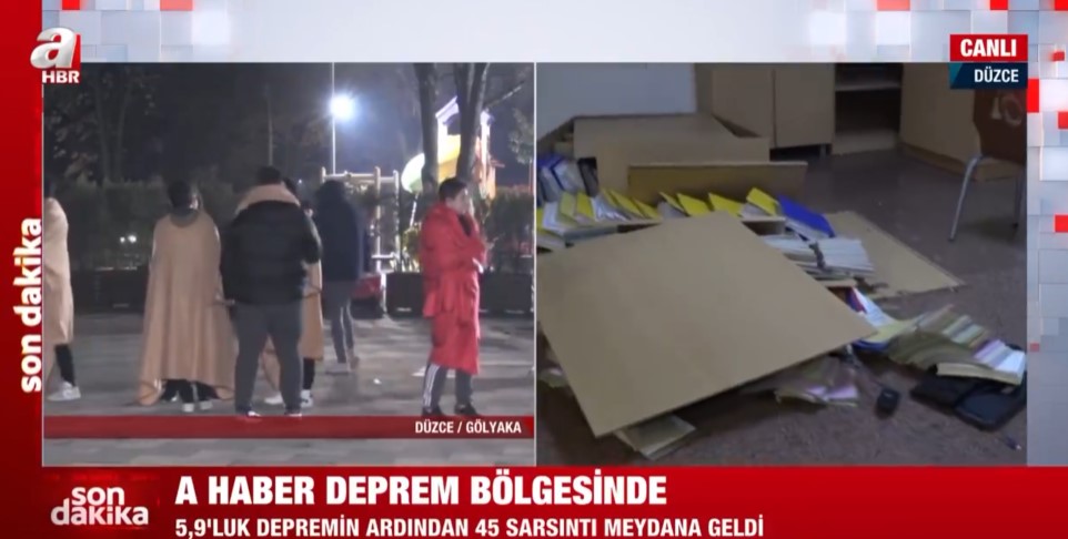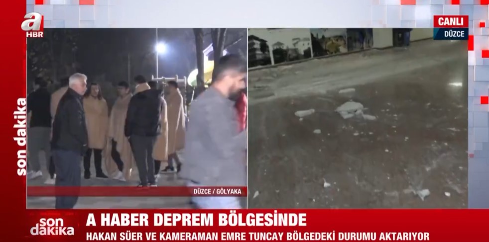 Düzce Gölyaka'da meydana gece saatlerinde gelen 5,9'luk depremin ardından A Haber ekipleri sahaya indi. Düzce'de vatandaşlar sokağa dökülürken, A Haber muhabiri Hakan Süer belediye binasını görüntüledi.