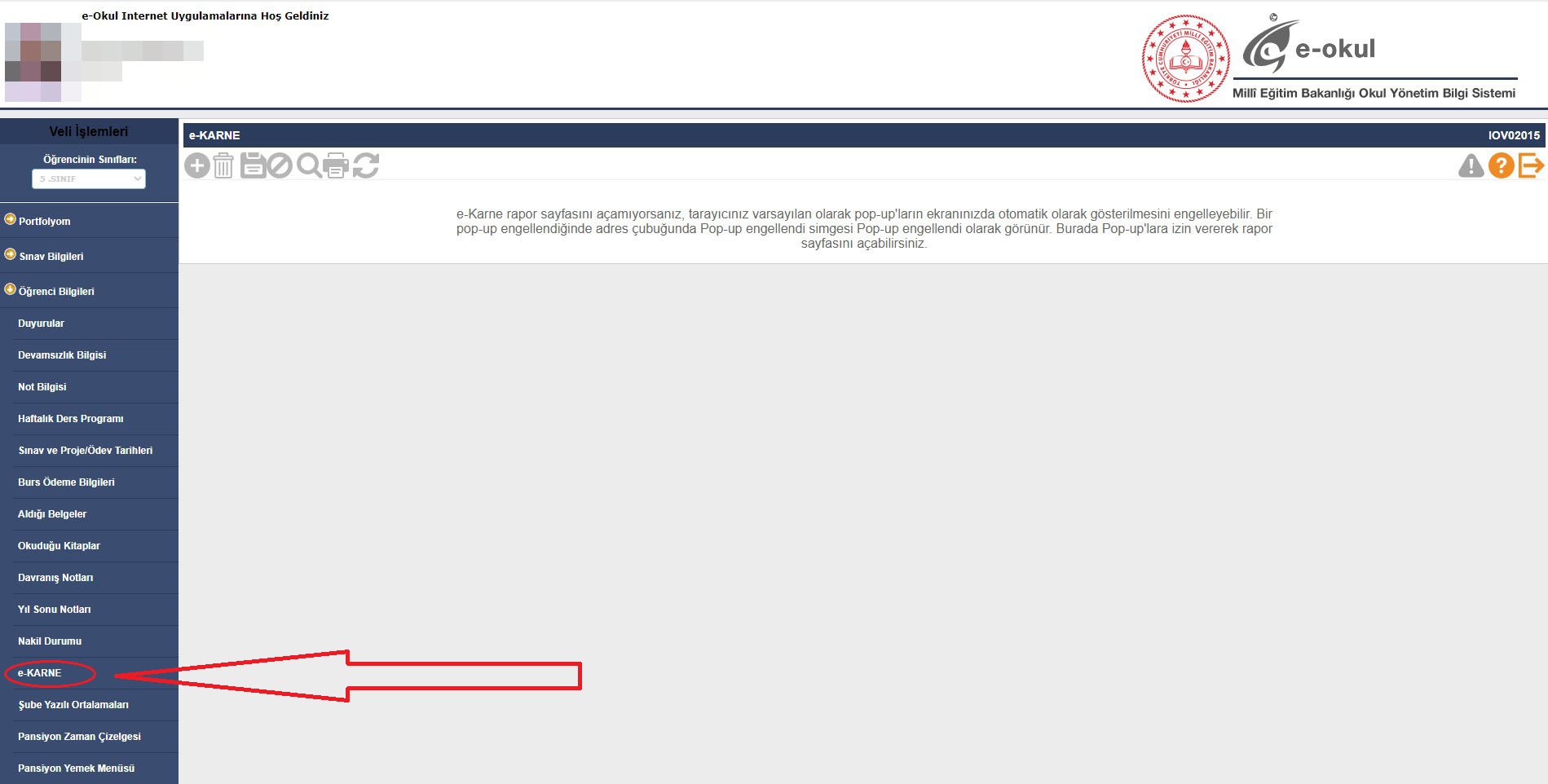 Eğer tarayıcınızda Pop-Up engelleyici varsa karşınıza şu şekilde bir uyarı çıkacaktır; "e-Karne rapor sayfasını açamıyorsanız, tarayıcınız varsayılan olarak pop-up'ların ekranınızda otomatik olarak gösterilmesini engelleyebilir. Bir pop-up engellendiğinde adres çubuğunda Pop-up engellendi simgesi Pop-up engellendi olarak görünür. Burada Pop-up'lara izin vererek rapor sayfasını açabilirsiniz."