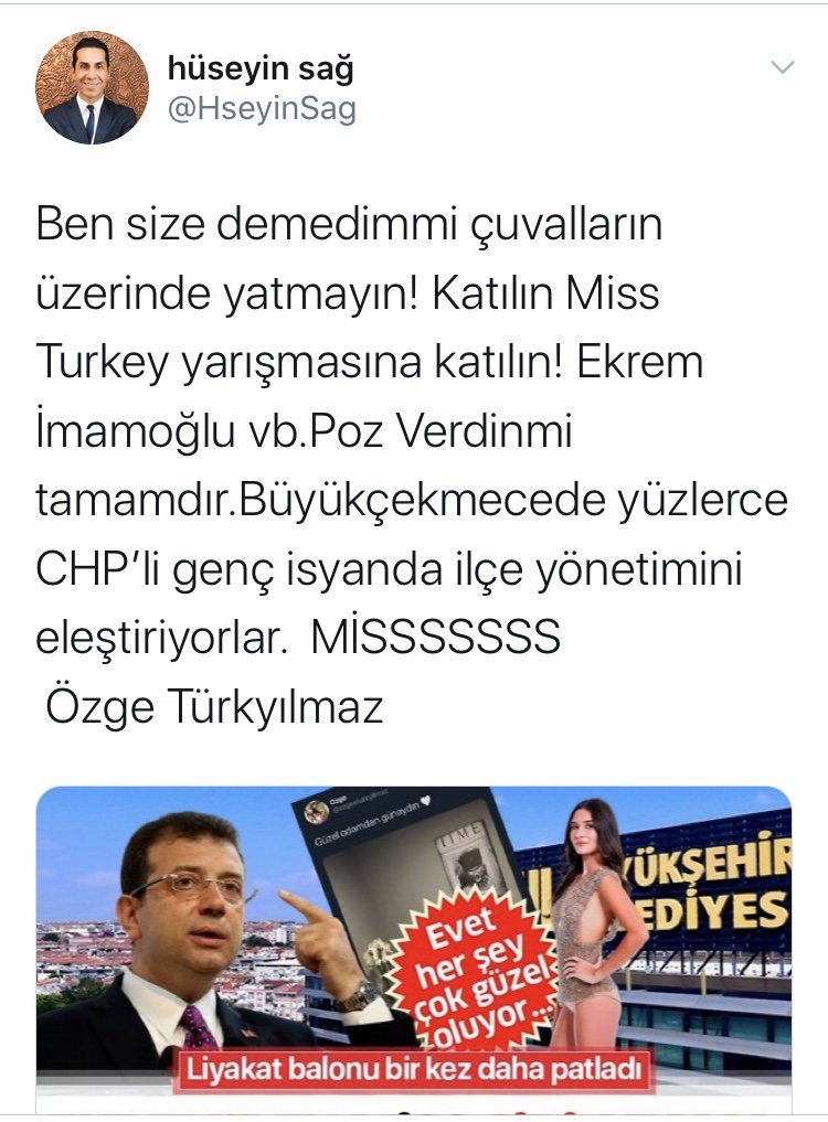 Hüseyin Sağ, sosyal paylaşım sitesi Facebook'taki şahsi hesabından paylaşımda bulundu. Sağ; "Ben size demedim mi? Çuvalların üzerinde yatmayın! Katılın Miss Turkey yarışmasına katılın! Ekrem İmamoğlu'yla poz verdin mi? Tamamdır.